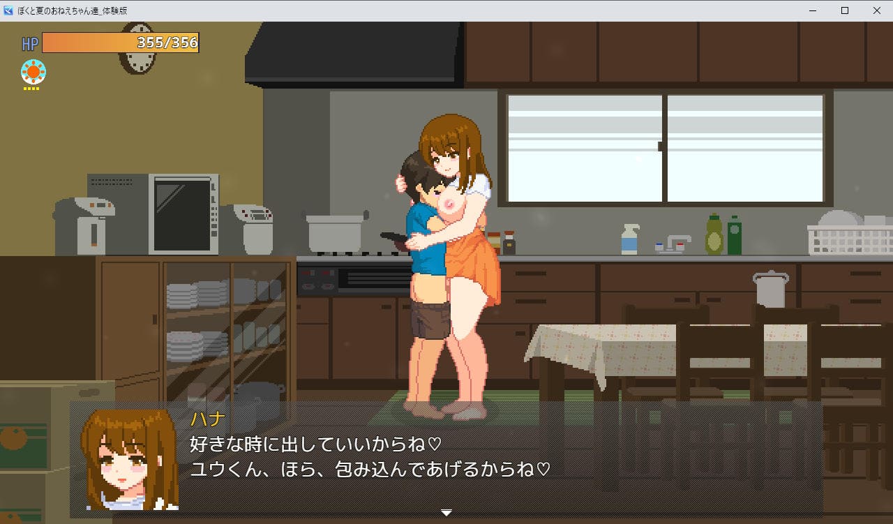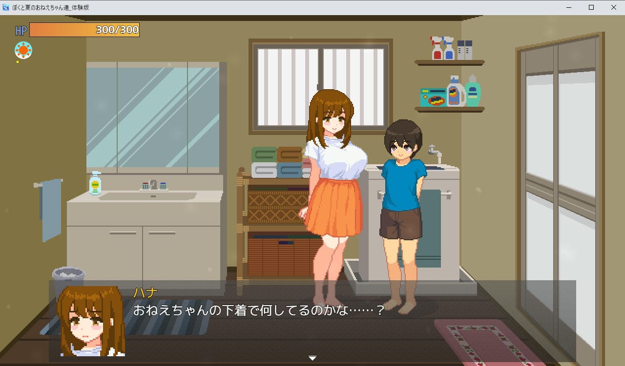ヒロインは各時間帯で1か所にしかいないのではなく本当にいろんなところにいる。例えば、昼時間帯のハナは家の中だけでも、脱衣所、キッチンにいて、それぞれでエロ内容は異なる。体験版では家の外には出られないが、製品版では外にもいるんじゃなかろうか。