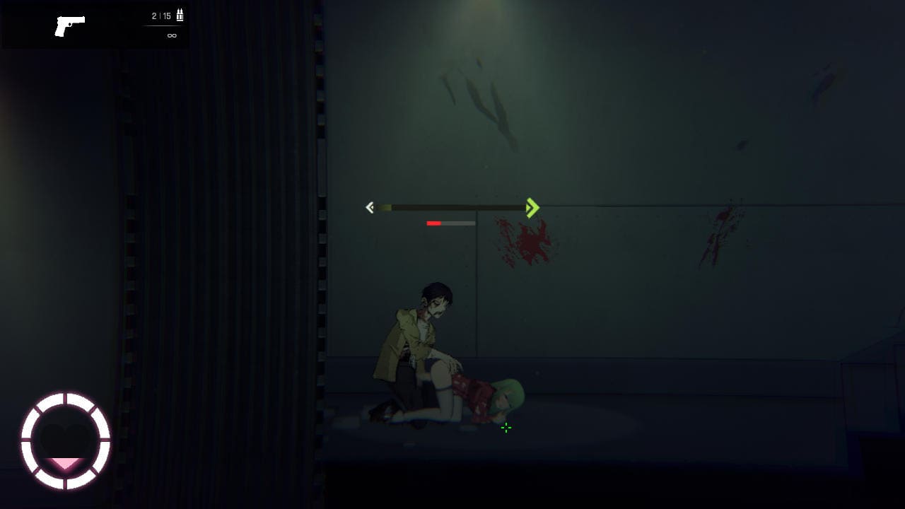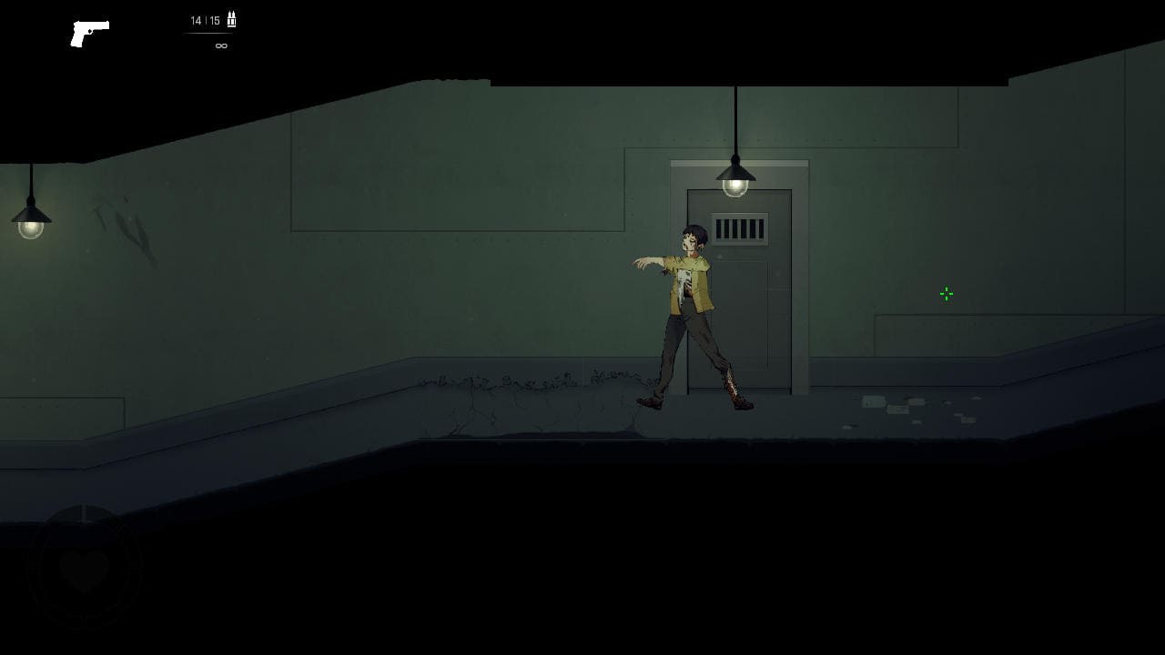 ▲ハンドガンゲット。緑のマウスカーソルでエイム、左クリックで射撃、Rでリロード。ハンドガンのマガジンは∞。銃にはライトがついていて暗闇を照らすのにも使う