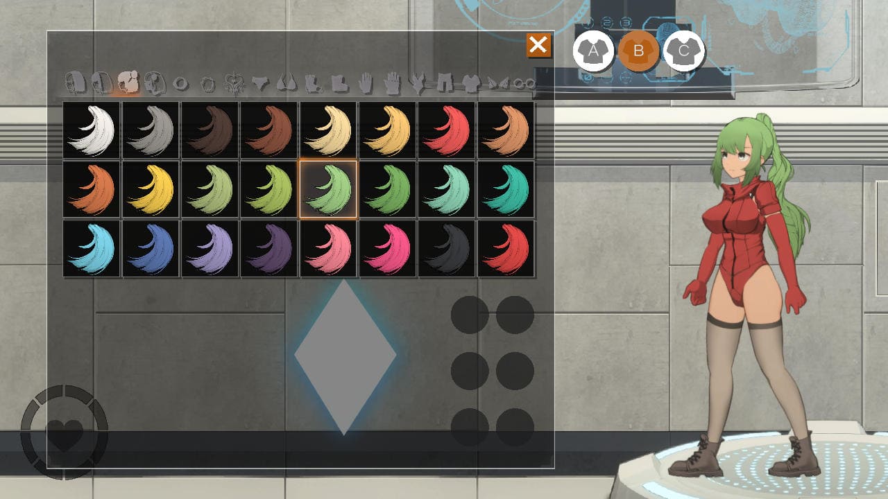 本作は主人公のビジュアルを結構細かくカスタマイズできるのが一つのウリで、行く先々を探索して得られるカスタムパーツが増えていくことでバリエーションが拡がっていく。体験版範囲の序盤でも髪色や目を変更できたりでデフォのビジュアルとはかなり印象を変えることができる。