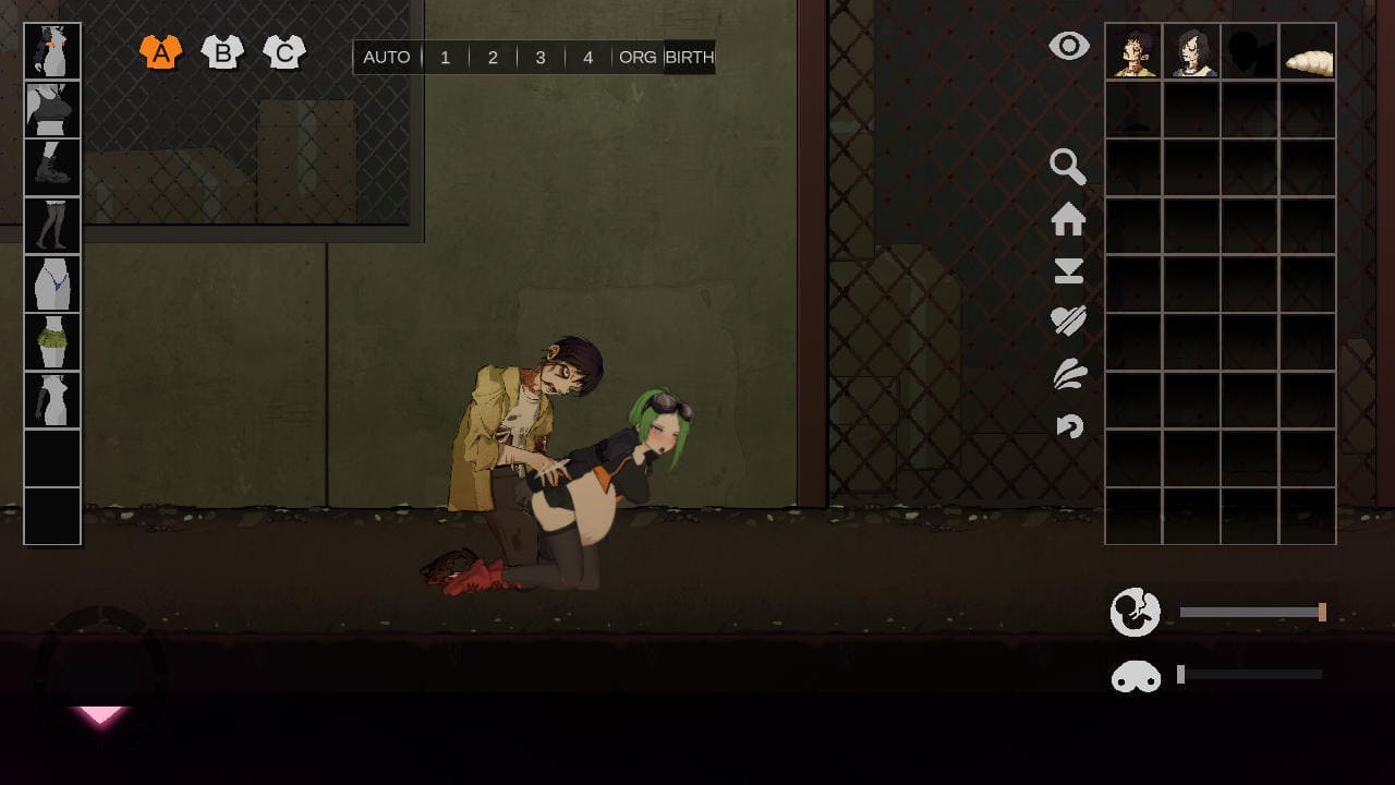 本作の敵の攻撃はエロのみで、敵に接触されるとSpineアニメによるアクションエロ、各敵に2段階+フィニッシュ、エロられるほど服が破れ画面左下の♡ゲージも貯まっていき、♡ゲージMAXでGAMEOVER。個人的にはちょっとアニメが粗めでほどほどに使える感じ、まぁ紳士による。