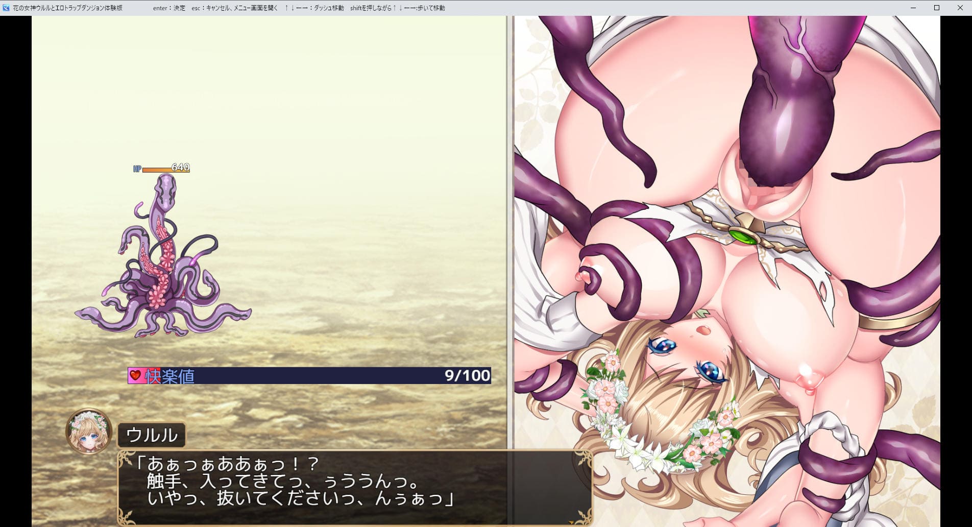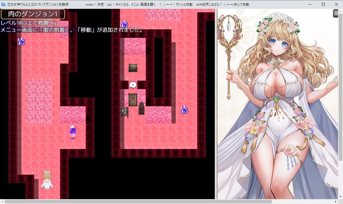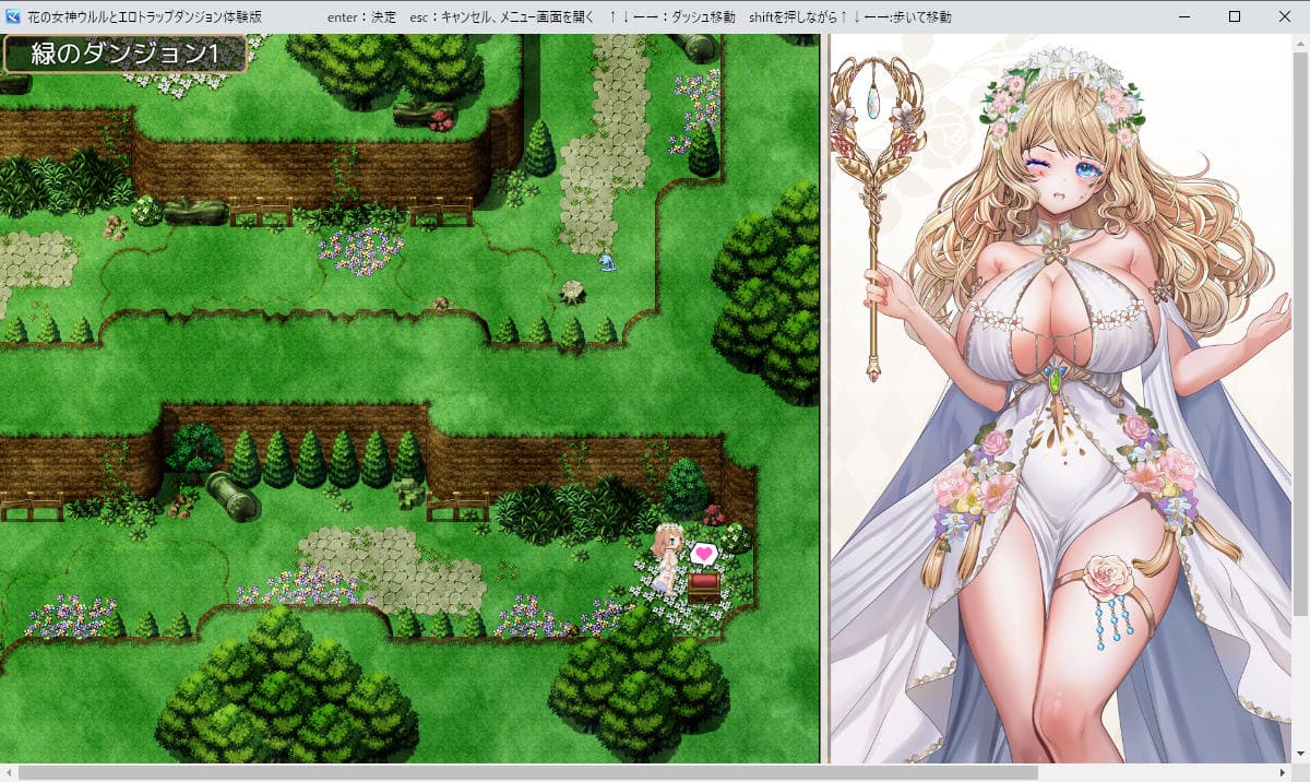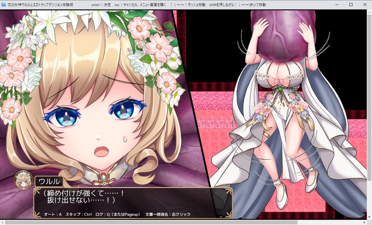 神としての力がイマイチな花の女神・ウルルが主人公、学園に通うための「神の証」を得るべく「エチナダンジョン」に潜るMZ製のRPG。その名の通りエッチなトラップや敵が満載の危険なダンジョン、花の女神は純潔を失うことなく攻略できるのか…