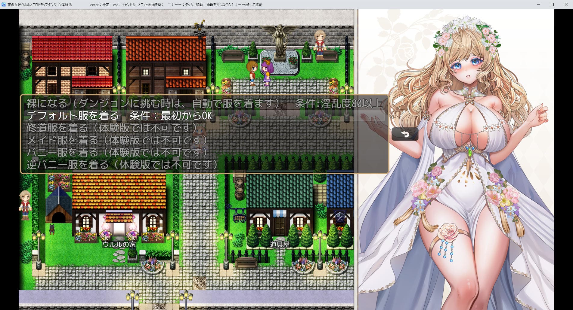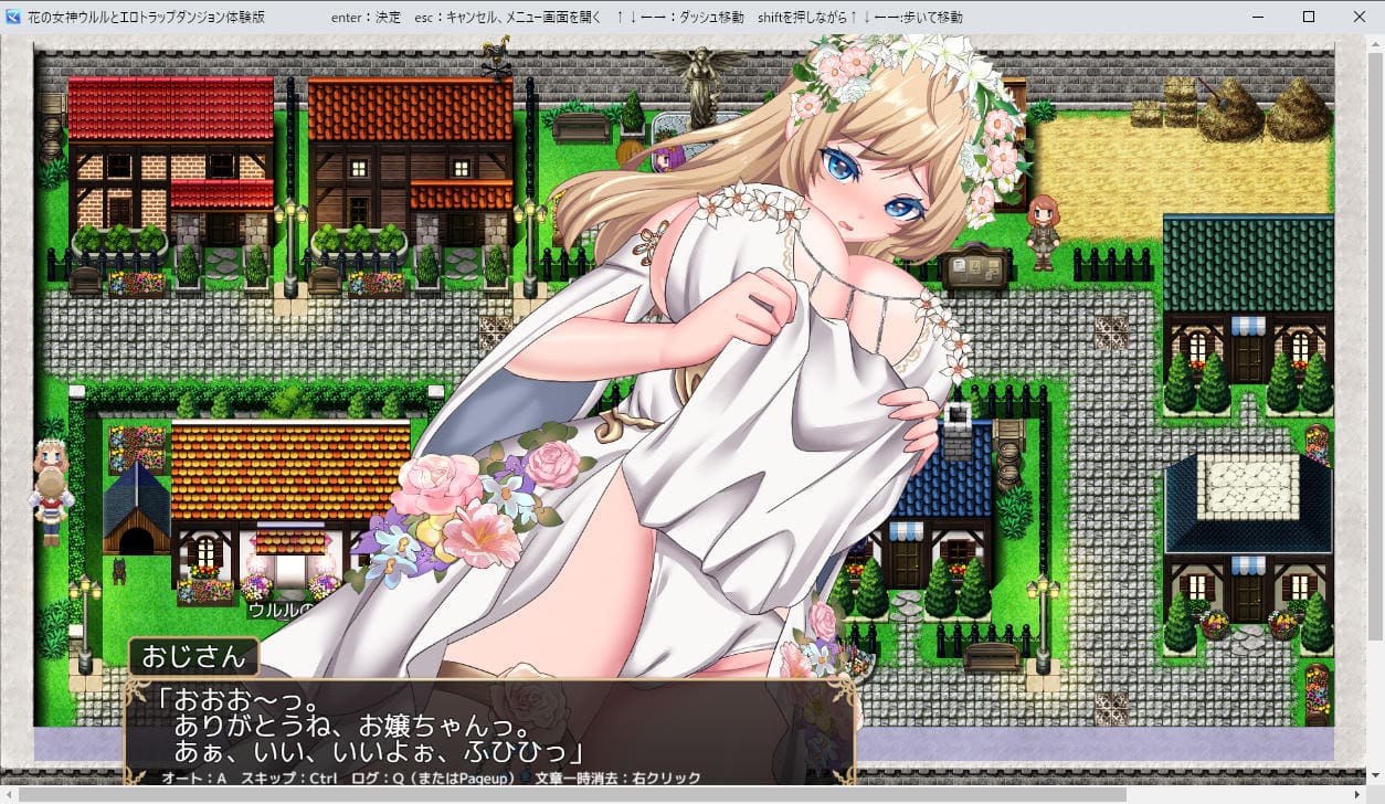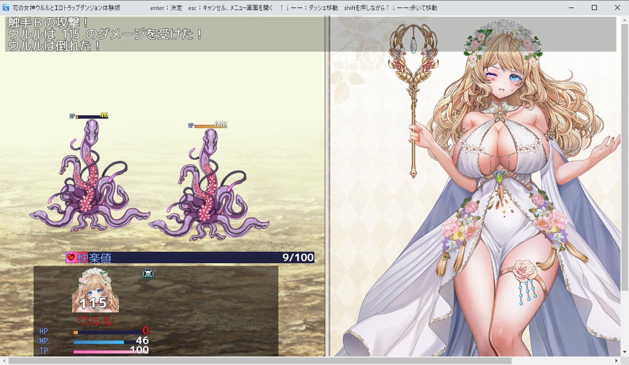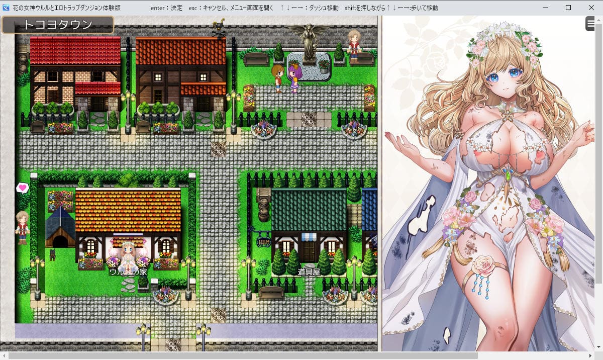 神としての力がイマイチな花の女神・ウルルが主人公、学園に通うための「神の証」を得るべく「エチナダンジョン」に潜るMZ製のRPG。その名の通りエッチなトラップや敵が満載の危険なダンジョン、花の女神は純潔を失うことなく攻略できるのか…