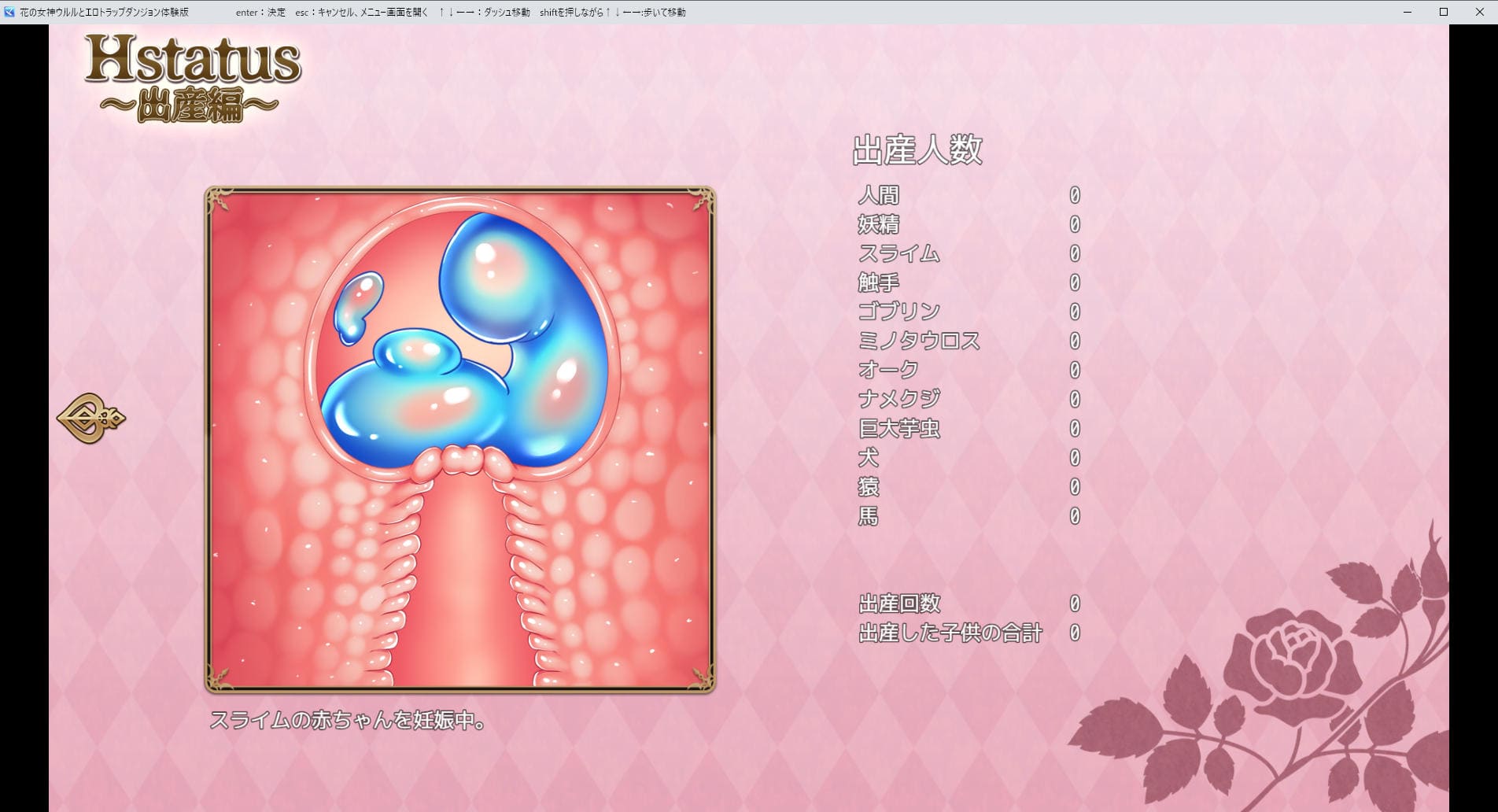 独特な世界観を除けばエロRPGとしてオーソドックスな部類、戦闘エロと敗北エロがメインでNPCエロもあり、処女クリア可。エロ嗜好はサークルさんの他作品同様、全裸土下座など若干の無様・屈辱系、状態異常系、妊娠・出産を含む。服の状態でNPCの反応変化、淫乱度でエロ差分3段階ありと、エロバリエーションが豊富でエンディングも7種もある。
