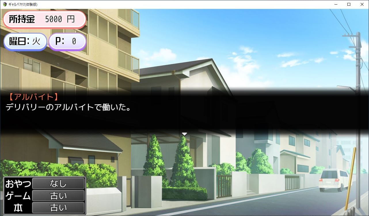 主人公はバイトをしないと生活していけないため、月水金の居酒屋バイト、火木のデリバリーバイトのどちらかを毎週選択する必要がある。どちらを選択しても得られるバイト代は同じで、つまるところバイトの選択は5人のヒロインの誰を開発していくかで決める。