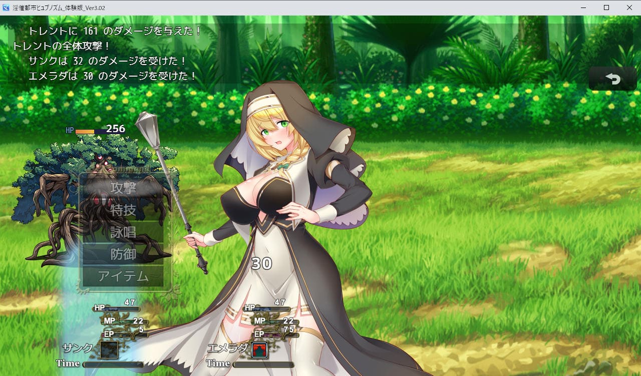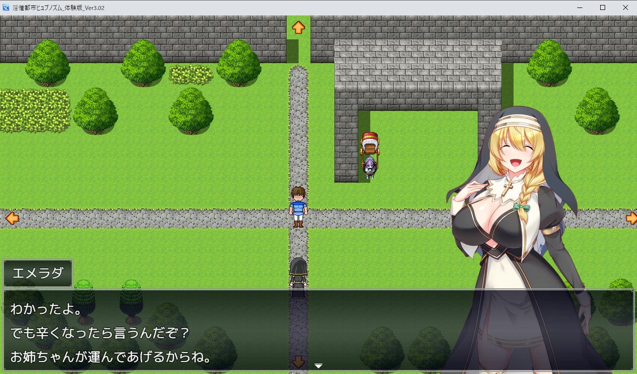 体験版では「未婚編」のごく序盤を遊べる。孤児院の幼馴染でお姉さん風を吹かせてくるエメラダとPTを組み、クエストをこなしていく。ごく序盤とはいえRPGとして結構やり応えがあり、2時間程度はプレイしたか。