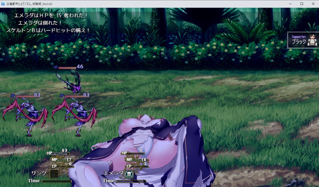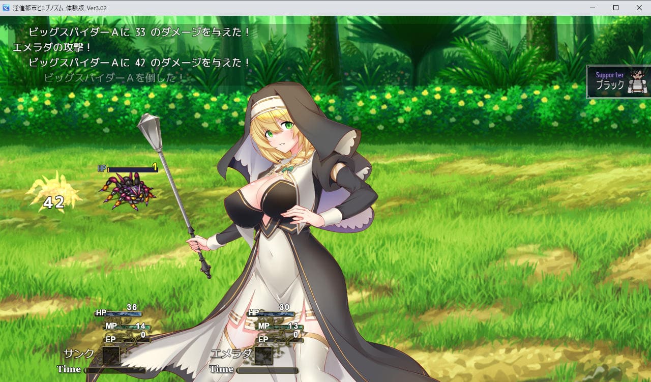 ▲戦闘画面ではヒロイン立ち絵が常に中央表示、アーマーブレイクあり。連れて行けるヒロインは1人のみ、サポート攻撃してくれる「サポーター」と最大3人PT。サポーターは新婚編以降はセクハラ要員になるらしい