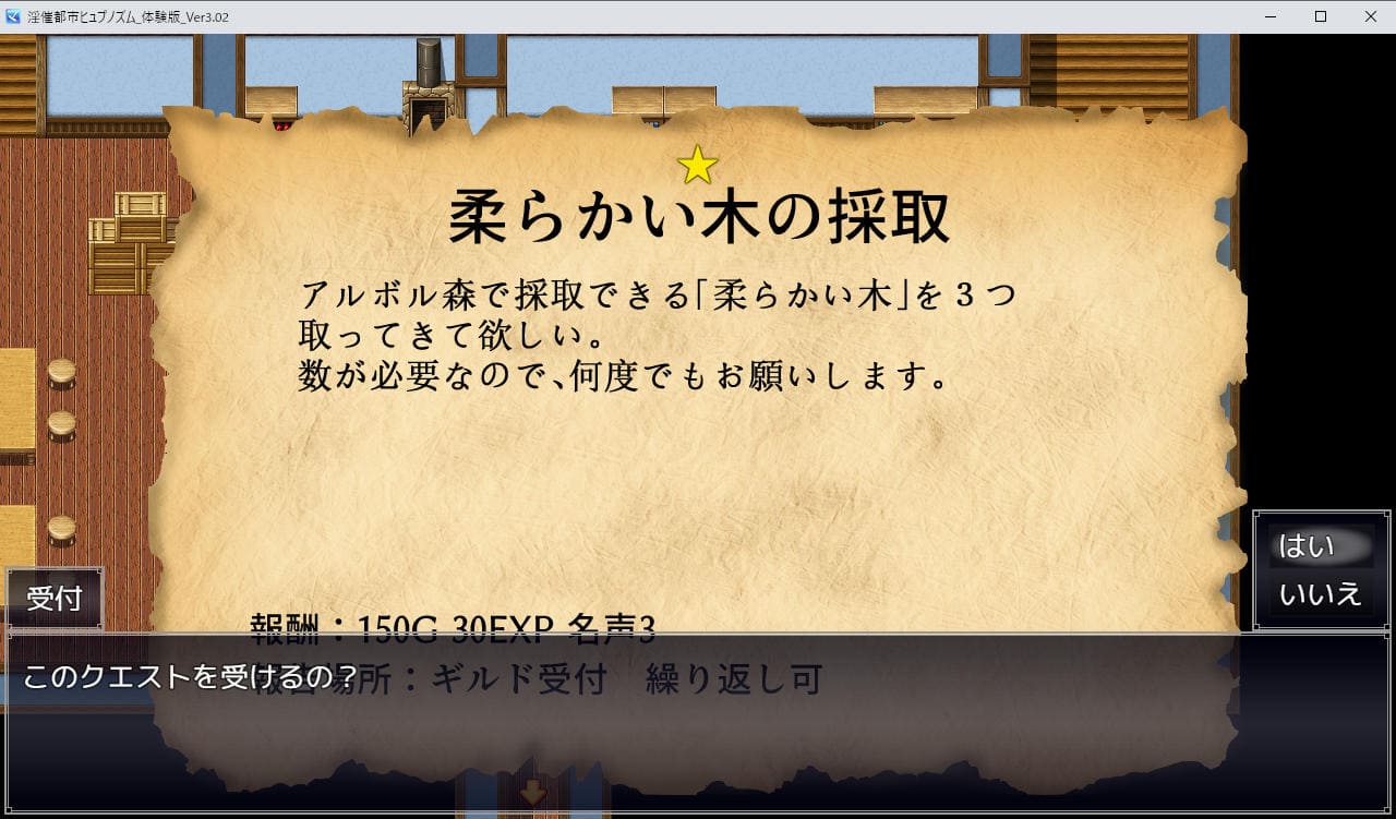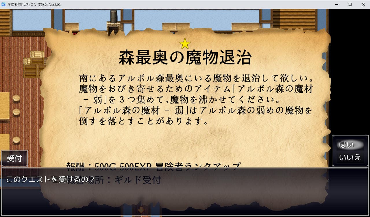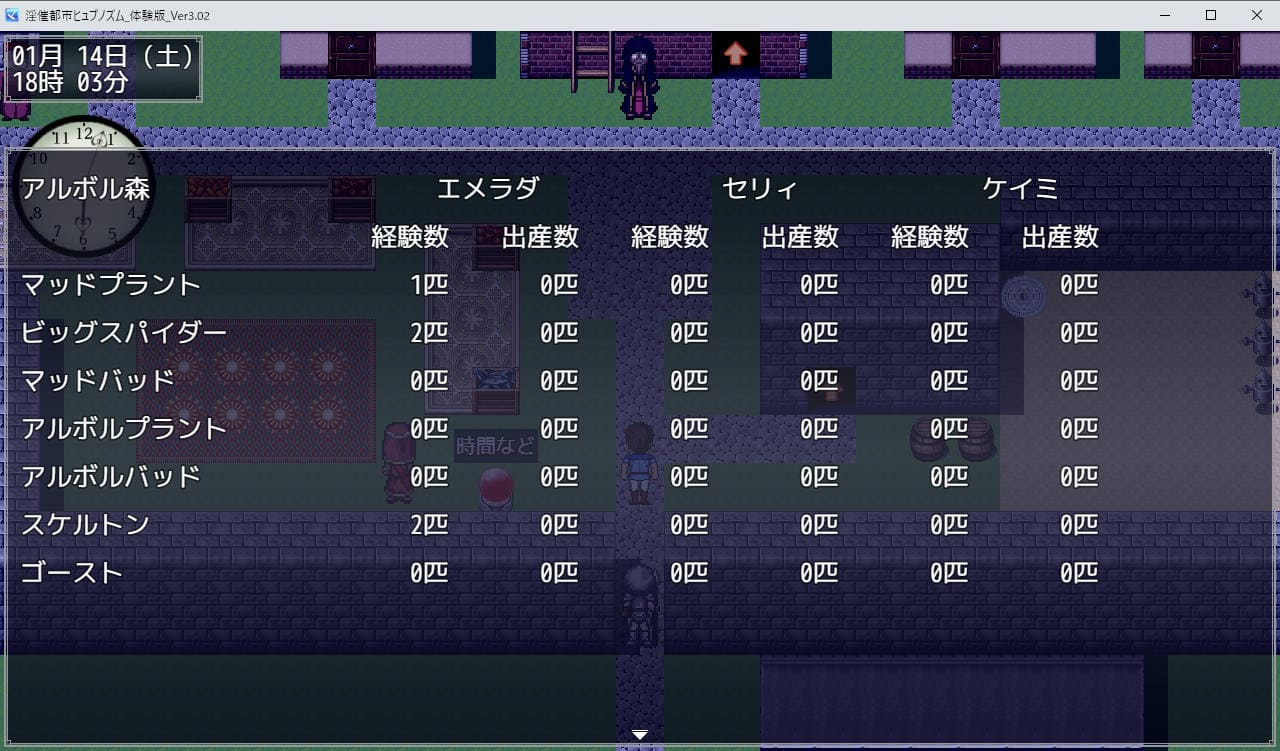 基本はギルドでクエストを受け、ダンジョンに潜り達成して名声・経験値とお金を稼ぐ。体験版で深くまで潜れるのは「森」のみだが、一定以上進むと敵が強くなり、夜時間帯(18:00以降)になると更に敵の強さが一段階上がる。
