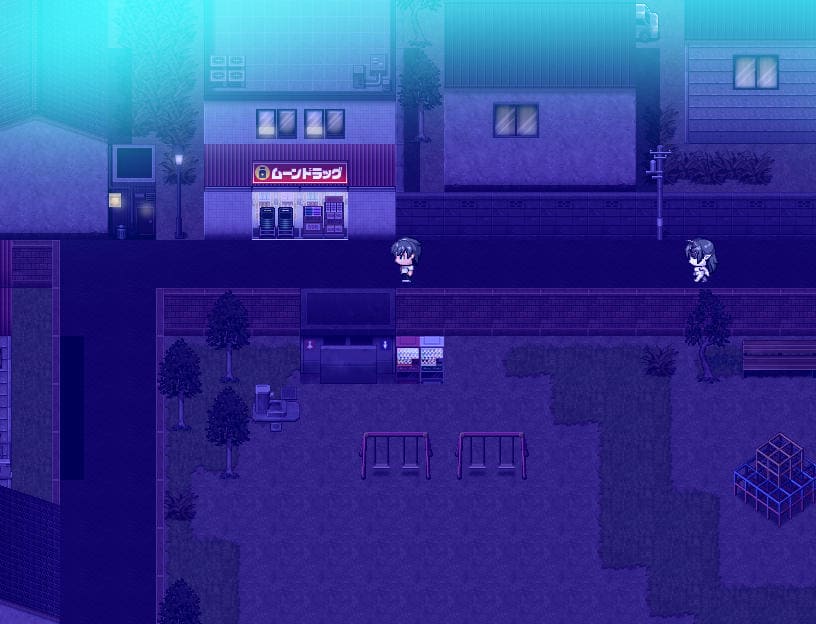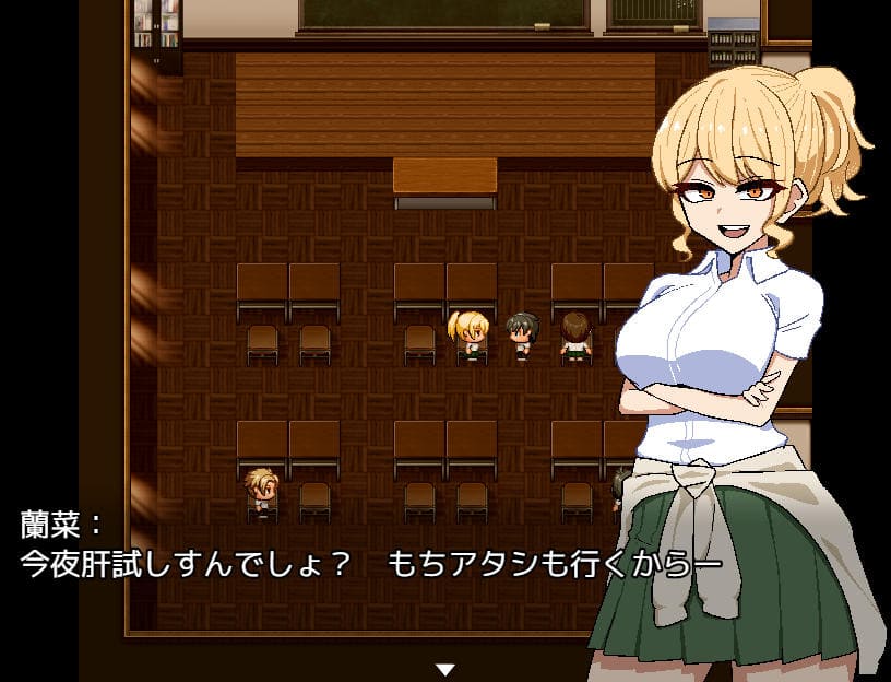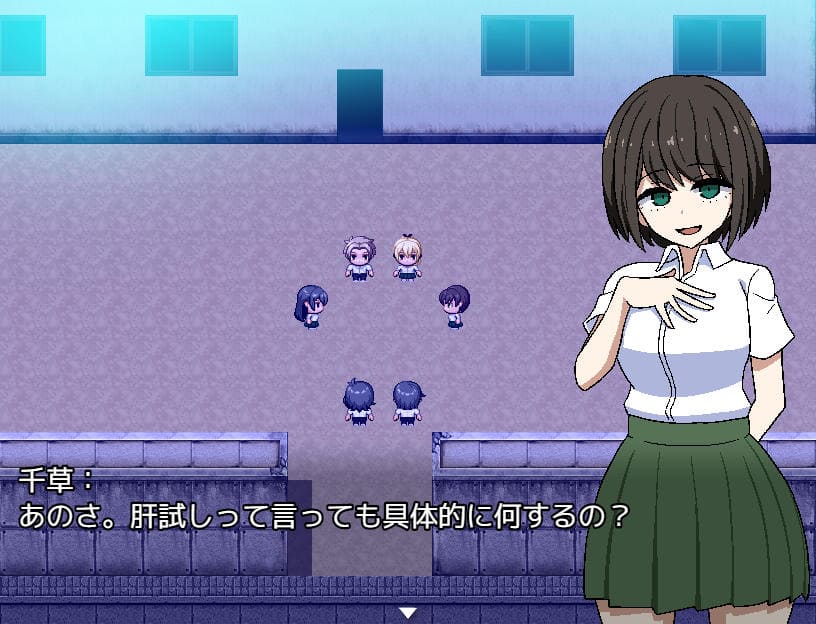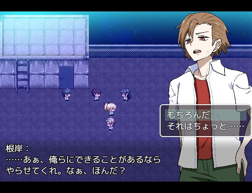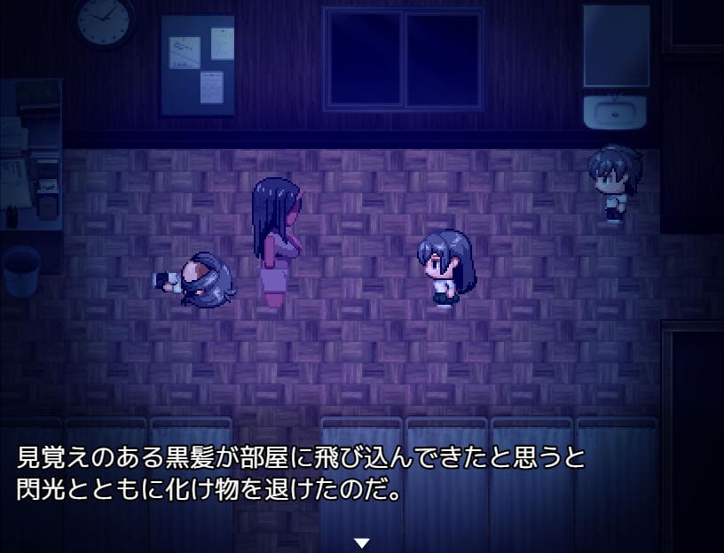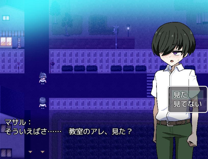 ▲夜、肝試しのため学校に向かう途中マサルと遭遇。主人公の前に教室を覗いていたムッツリ野郎