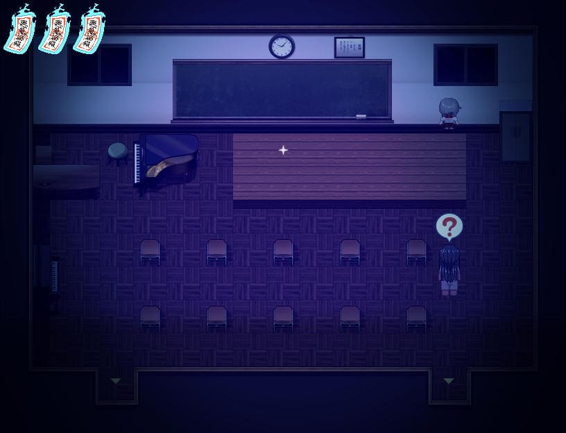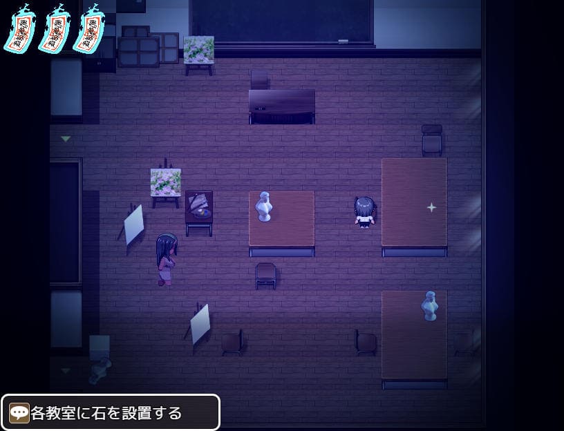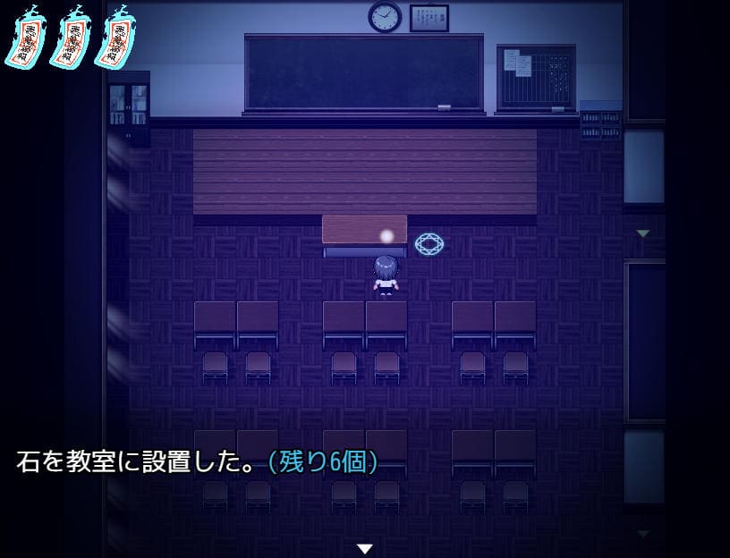 ここからが本番だ。赤鬼に見つからないように各教室を回り、瑠璃に渡された7つの石を設置する。赤鬼の出現頻度は高め、特に廊下はほぼ必ず徘徊しており、視界に入るとダッシュで追ってくる。今いるマップに入ってくることもある。