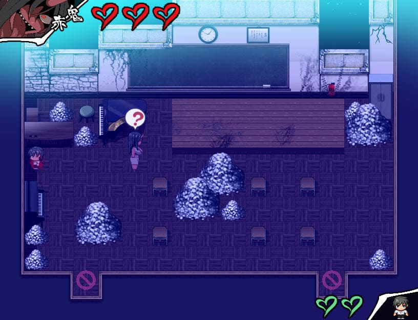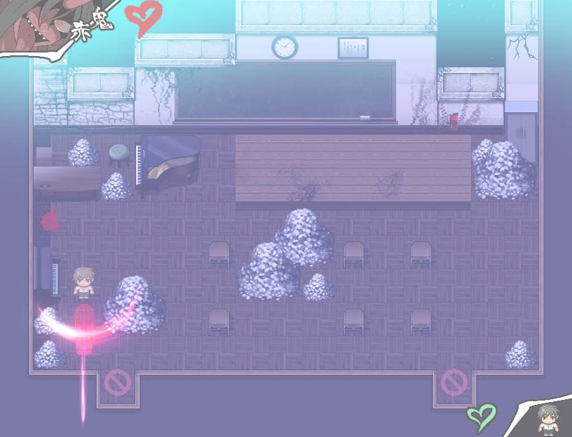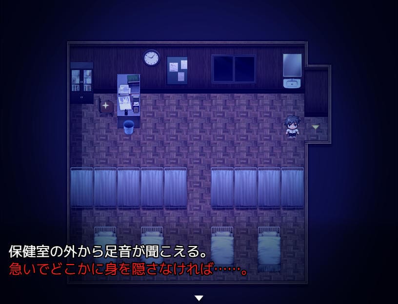何度かマップチェンジすれば逃げ切れ、冒頭で述べたルール「赤いモノ」に触れている間は認識されない。この学校内であれば「消火器」などが該当する。
