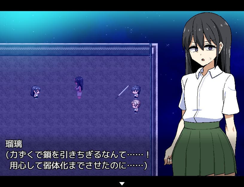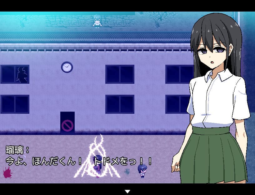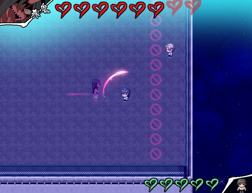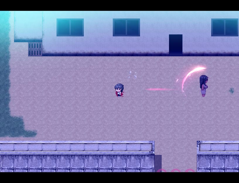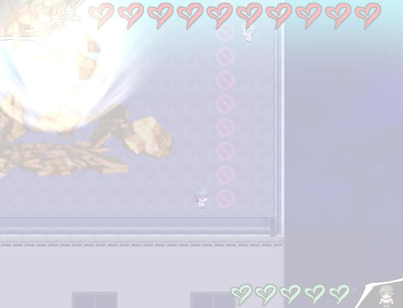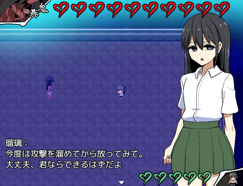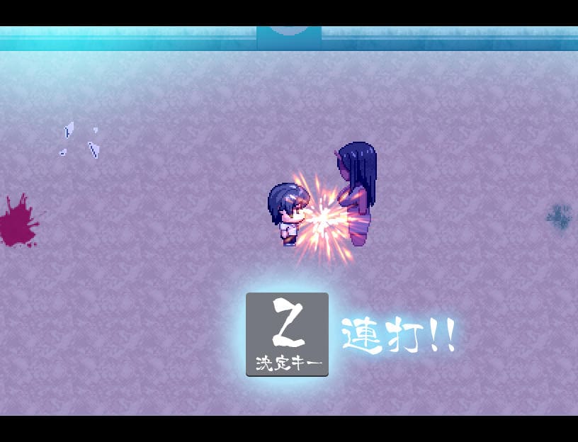 ▲瑠璃によるアクション指南あり。Zキーで前方横3マス攻撃、Zタメで前方縦3マスに居合斬り。Cキー長押しで深呼吸(♡回復)