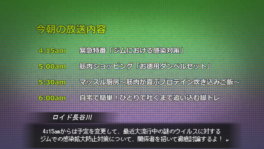 ▲謎のウイルスなんてプロテインと筋肉でへっちゃらさ! こんな感じの番組を数日分見ていくと