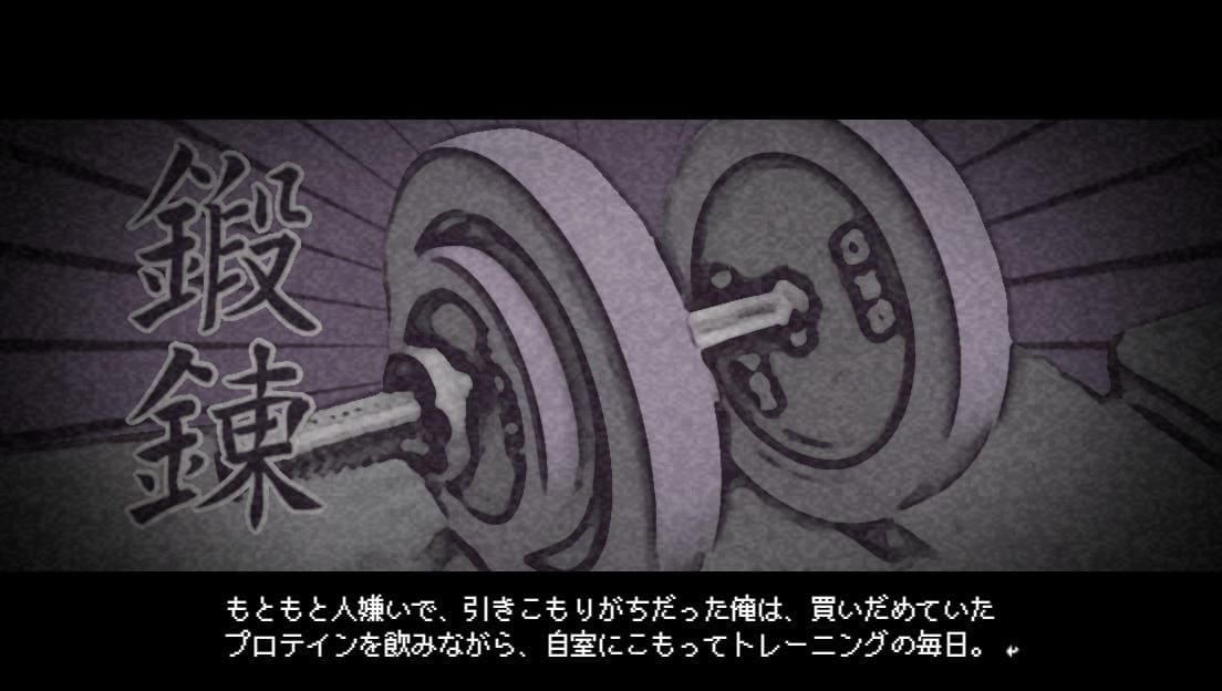 ▲世界が滅びようとしていた頃、主人公はひきこもってトレーニング生活を送っていた。物資狙いの略奪者は筋肉で返り討ちにした