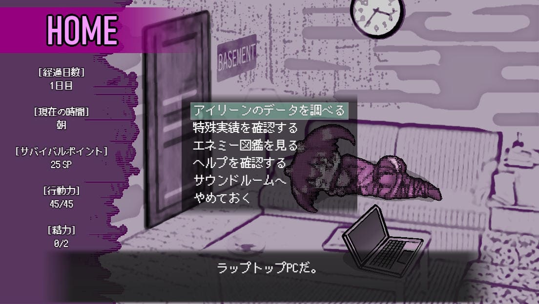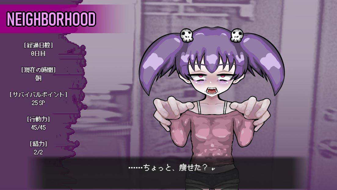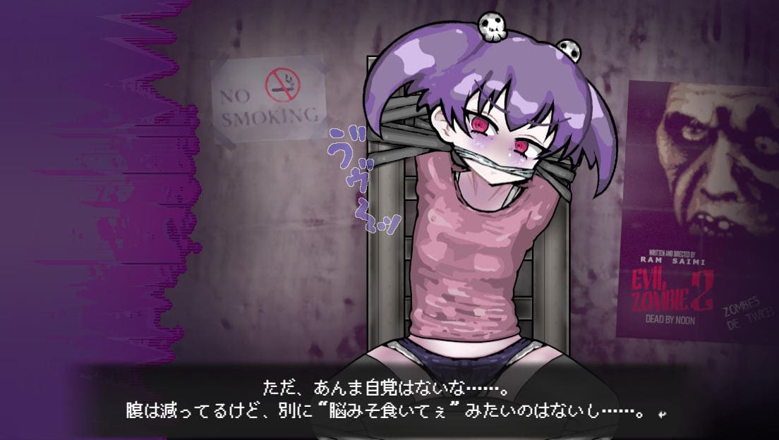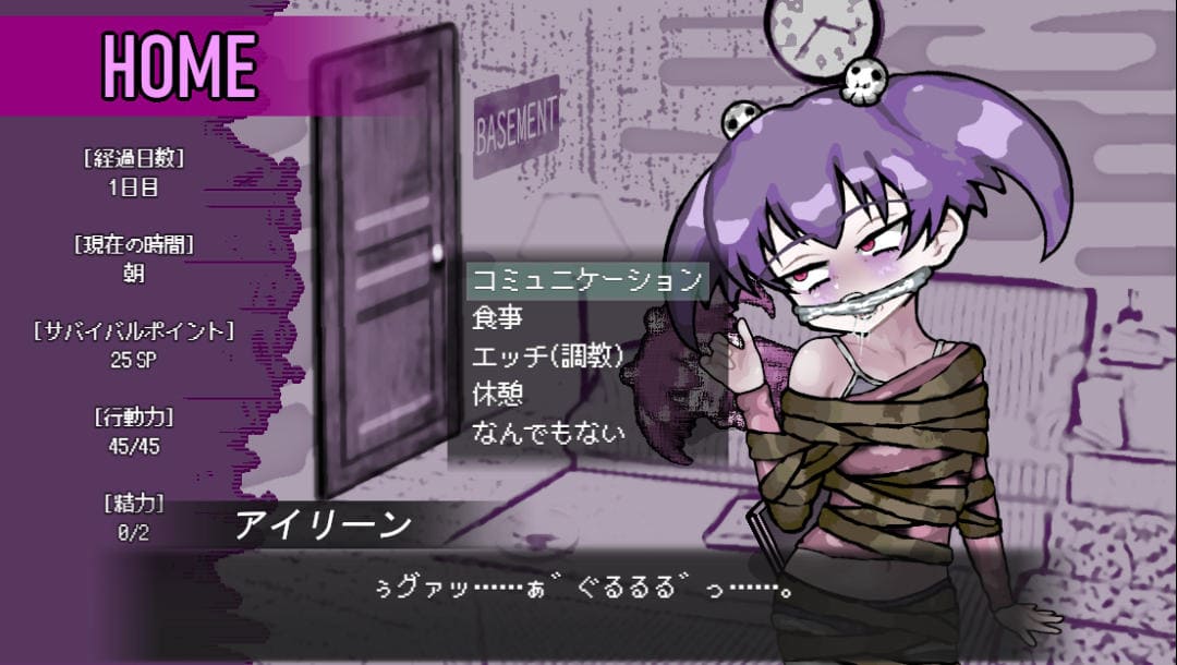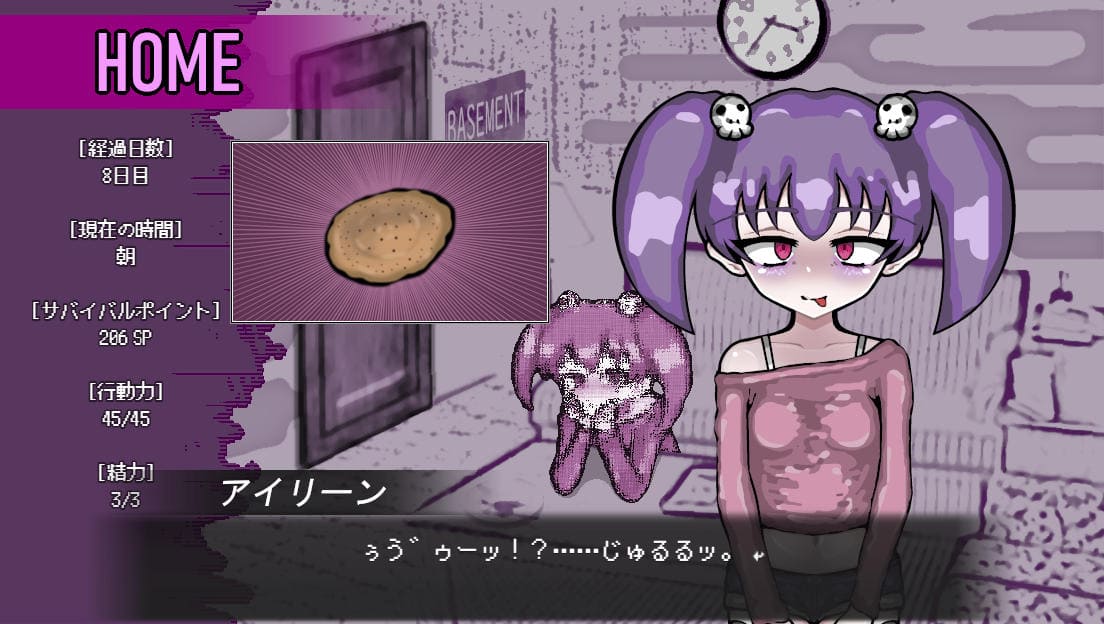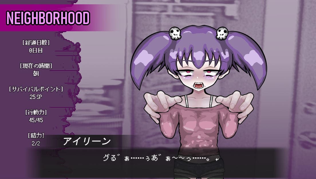 ゾンビウイルスにより終末を迎えた世界、抗体を持った主人公(名前なし)がサバイバル生活しつつゾンビ娘のアイリーンを囲う、MV製のADVRPG+おさわりSLG。主人公は備蓄と筋肉でパンデミックをひっそり生き延びたものの流石に物資の調達が必要となり。そんな折昔よく家に遊びに来ていた近所の子・アイリーンのことを思い出し探してみると、見つけた彼女は既にゾンビ化していた。