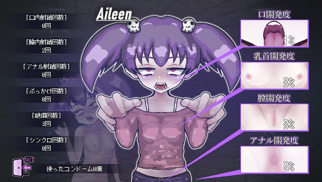 おさわりや挿入で画面左上の「絶頂メーター」が上昇、上昇速度は各部位の開発度次第、絶頂メーターMAXでアイリーン絶頂。主人公は挿入などチ〇ポに刺激を受けるプレイでのみ「射精そう%」が上昇、100%で中出し、外出しを選択。主人公とアイリーンが同時に絶頂すると「シンクロ回数」が加算され、エロ後のLOVE度や淫乱度の上昇に影響する(おそらく)。