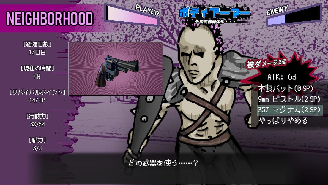 ▲マグナムを購入、消費SPはデカいがかなり強い。ボディアーマー装備の敵には近接武器が効きづらいなどのデバフあり
