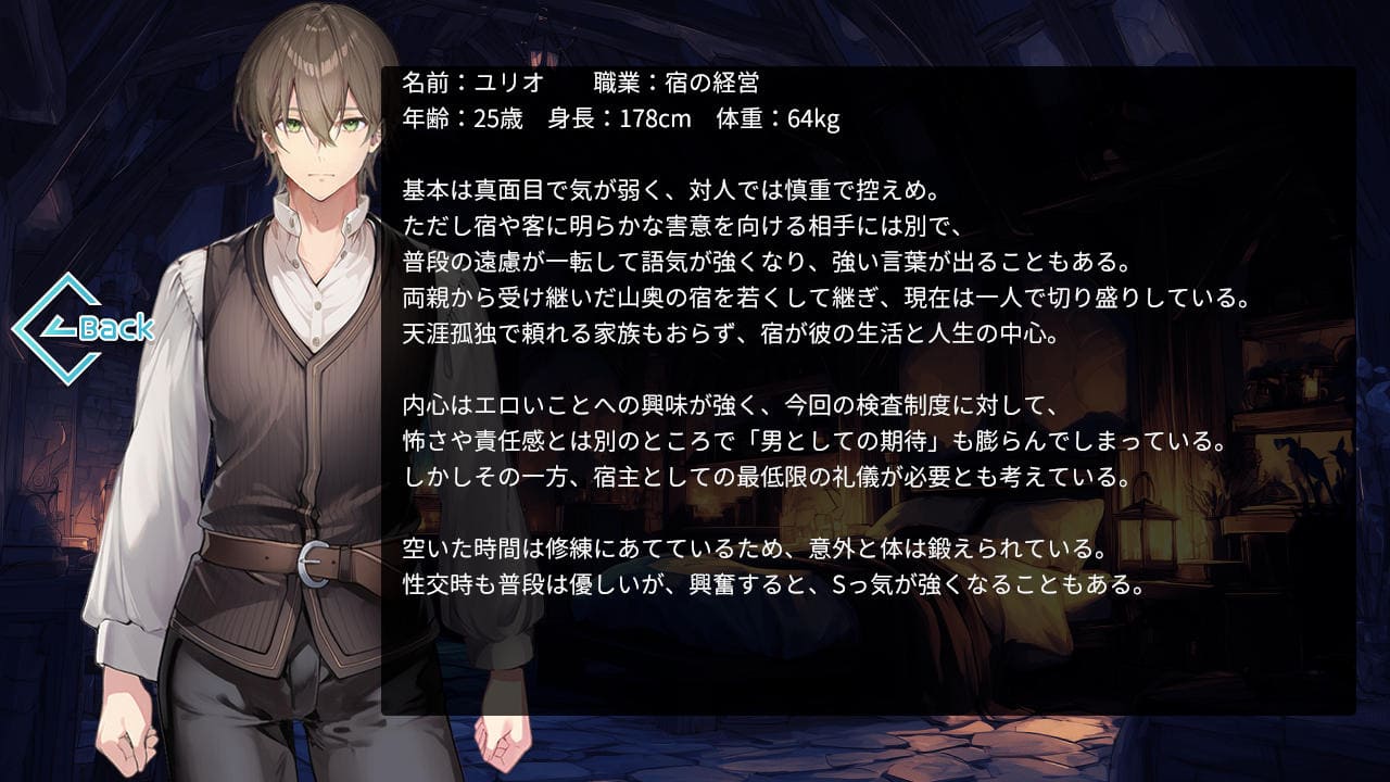 毎夜3人ずつが「滞在させてほしい」と宿を訪れ、検査の対象となるお姉さんの数は20人にのぼる。検査の種類は各ヒロインにつき4種、よってエロは80シーン+α。αというのはもう1人エッチ可能ヒロインがいるらしいゆえ(全21人)。男の客もいるが検査はできない、検査したい場合は他を当たってくれ。