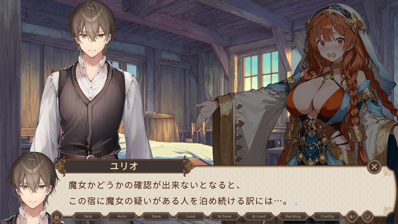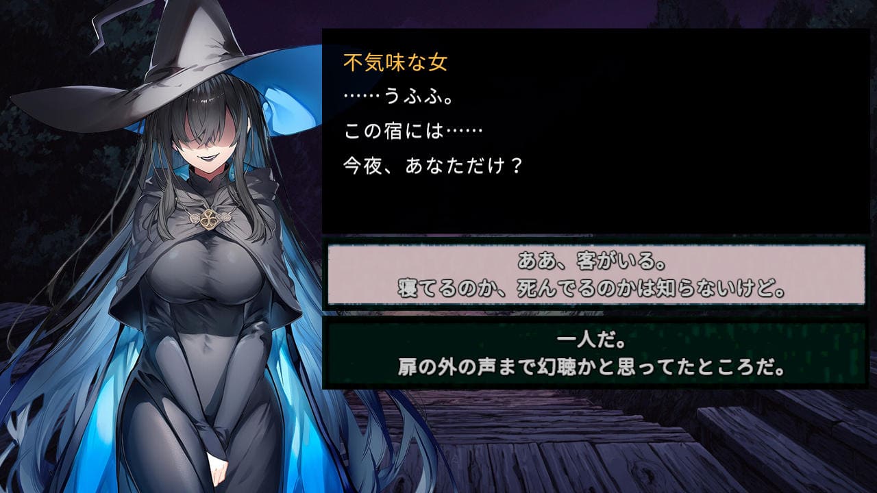 山奥で宿を一人で営むユリオ(25)が主人公、宿泊にくるお姉さん達に対し「検査」を行い、人を喰う「魔女」だと判断したら宿から追い出して安全を確保していく、いわゆる人狼タイプのUnity製SLG。宿泊客の中に魔女が1人以上いる場合、毎晩1人、人間の客が「失踪」してしまう。ゆえにしっかり「検査」する必要があるが…