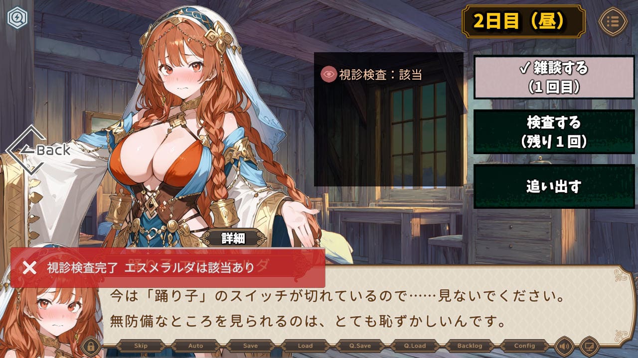 先にゲームのキモとなる部分を言ってしまうと、各ヒロインが魔女かどうかは固定ではない、毎回ランダムで決定される。↑の1日目の訪問客3人のうち1人も魔女がいないこともあったし、2人魔女だったこともあった。さすがに3人全員魔女、ということはないっぽく。
