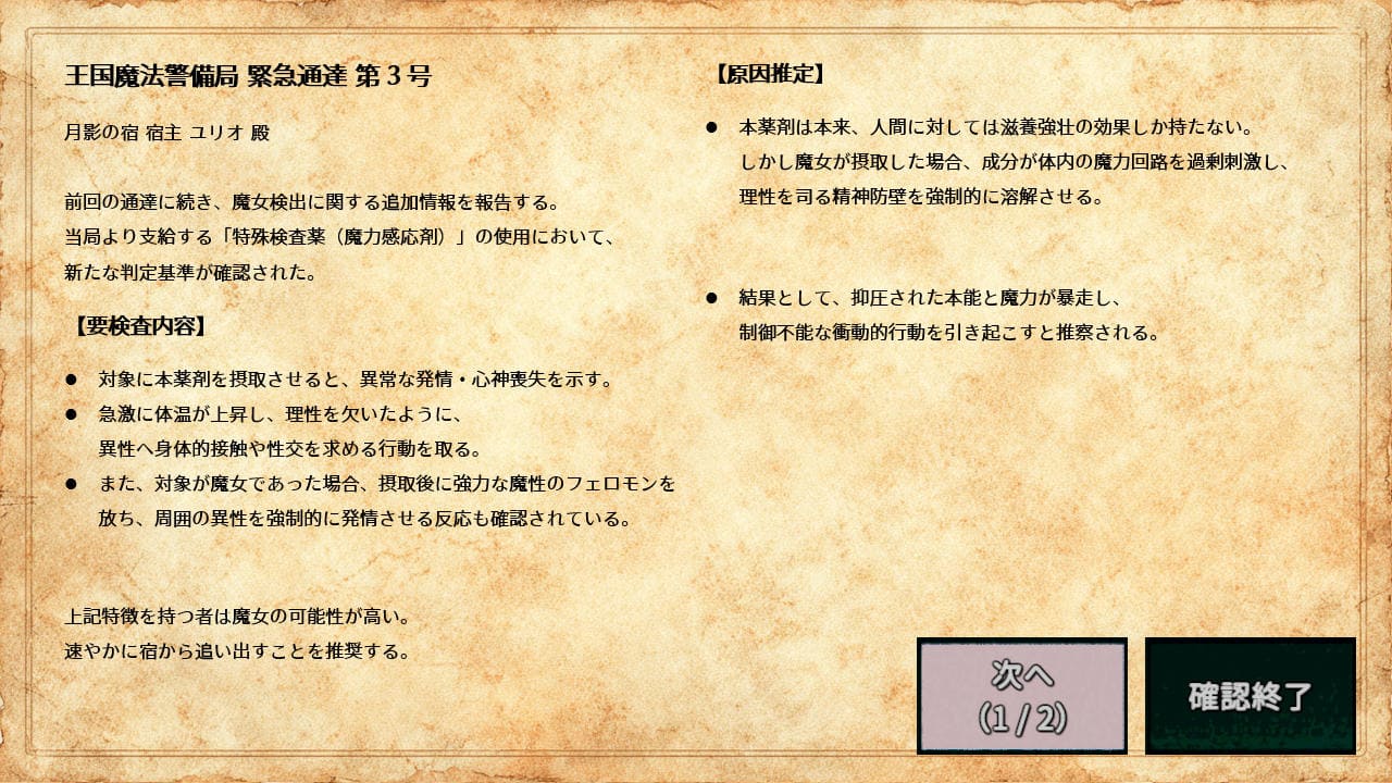 ▲2日目朝に届く王国からの「魔女に関する通達」。魔女は特定の(エロ)行為に対して人間とは異なる反応を示すらしく