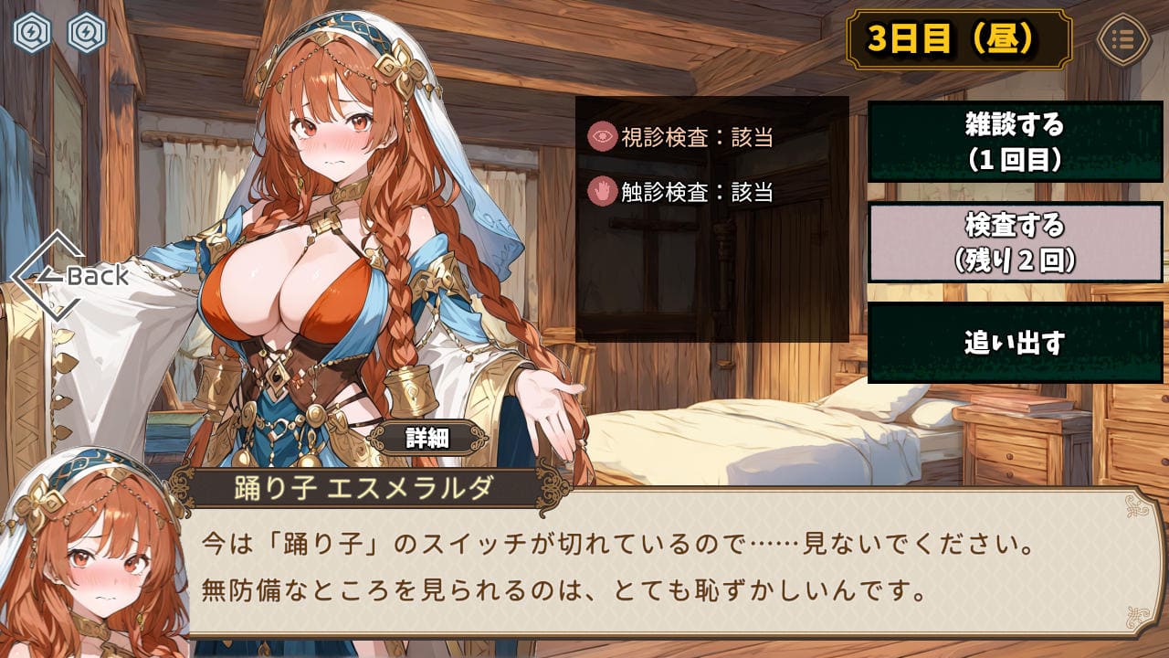 「雑談」は各ヒロイン4段階あり、行動力消費なしで拝見できる。じゃあ「検査」しようねぇ…