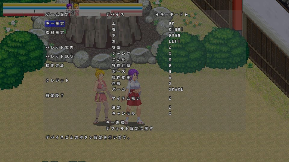 使うキーは↑のキー設定の通りだが、よく使うキーはZ攻撃、Xジャンプ、Cキーつかみ、Dキー各種特殊行動、Aキーキャラチェンジ、あたりかなぁと。