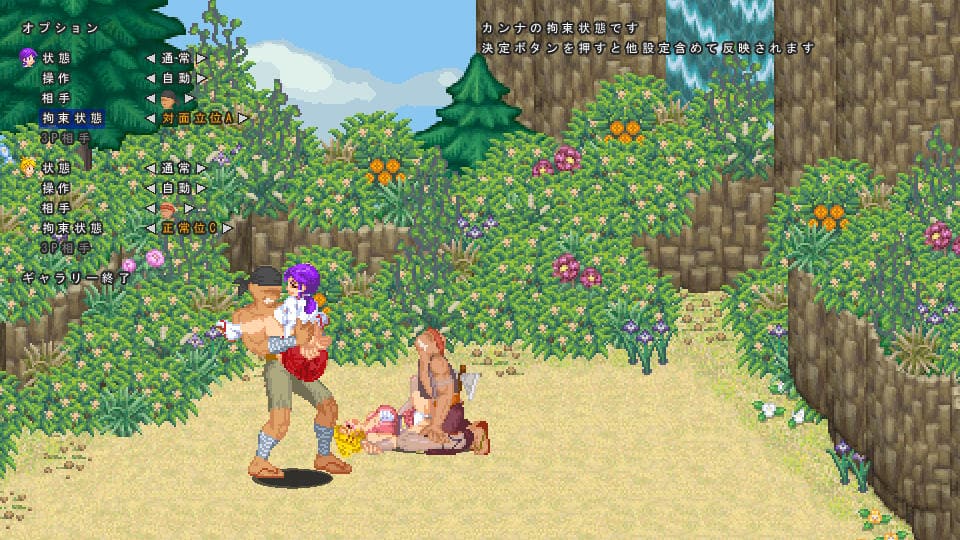 挿入されるとレバガチャで抜け出しにくくなるルールがありつつも、拘束・エロに対してCOMがどの程度抵抗するか、服の色の設定など、難易度含め全体的にある程度アレンジ可能な部分が多い