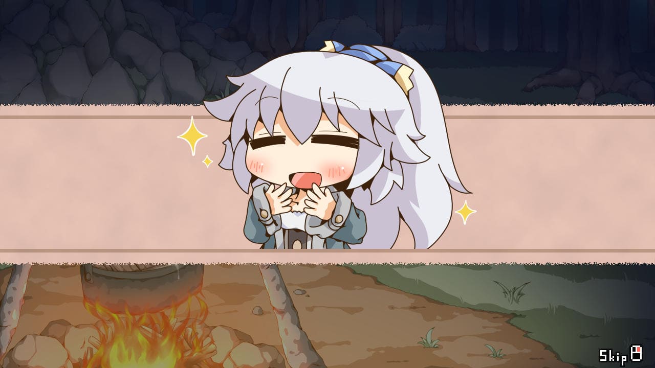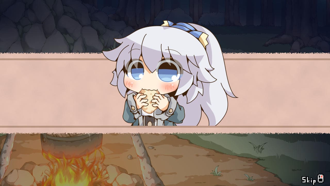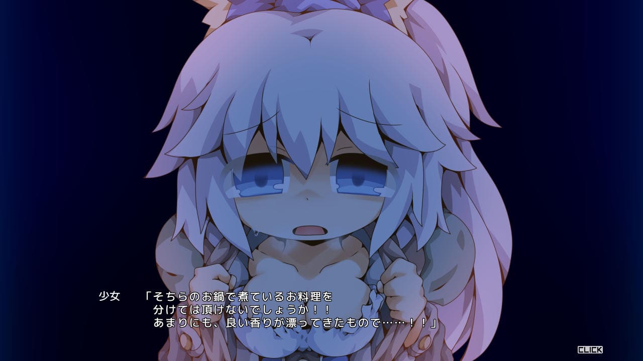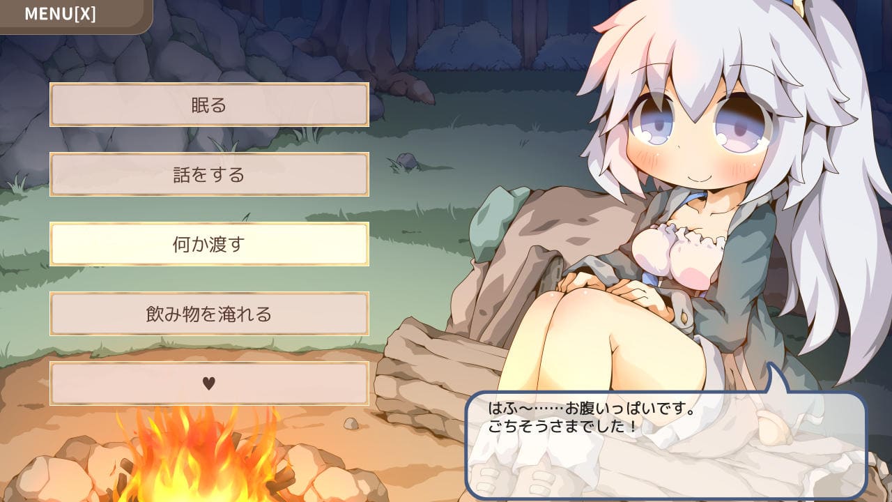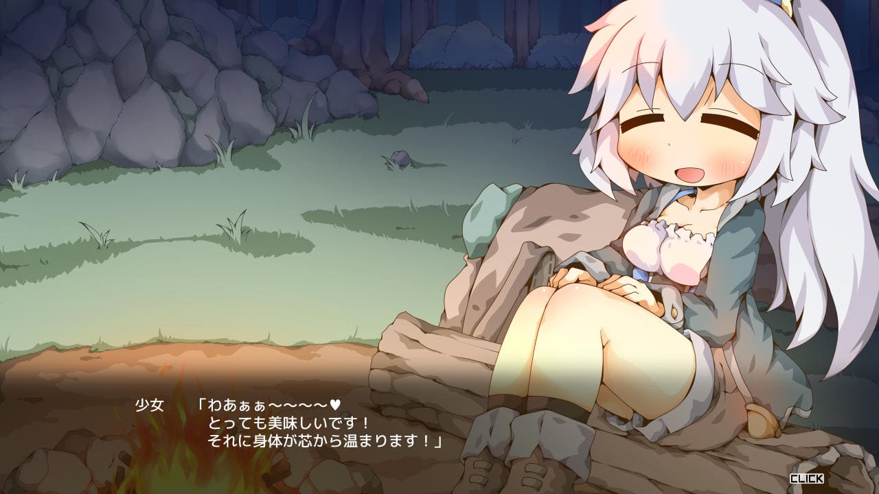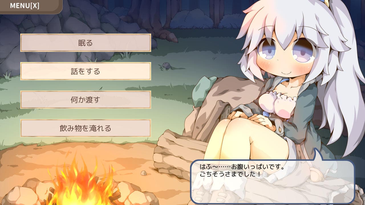 ▲主人公が夜営していたところに少女が現れるところからスタート。ここしばらく味のない携帯食しか食べておらずご相伴に預からせては頂けないか、と