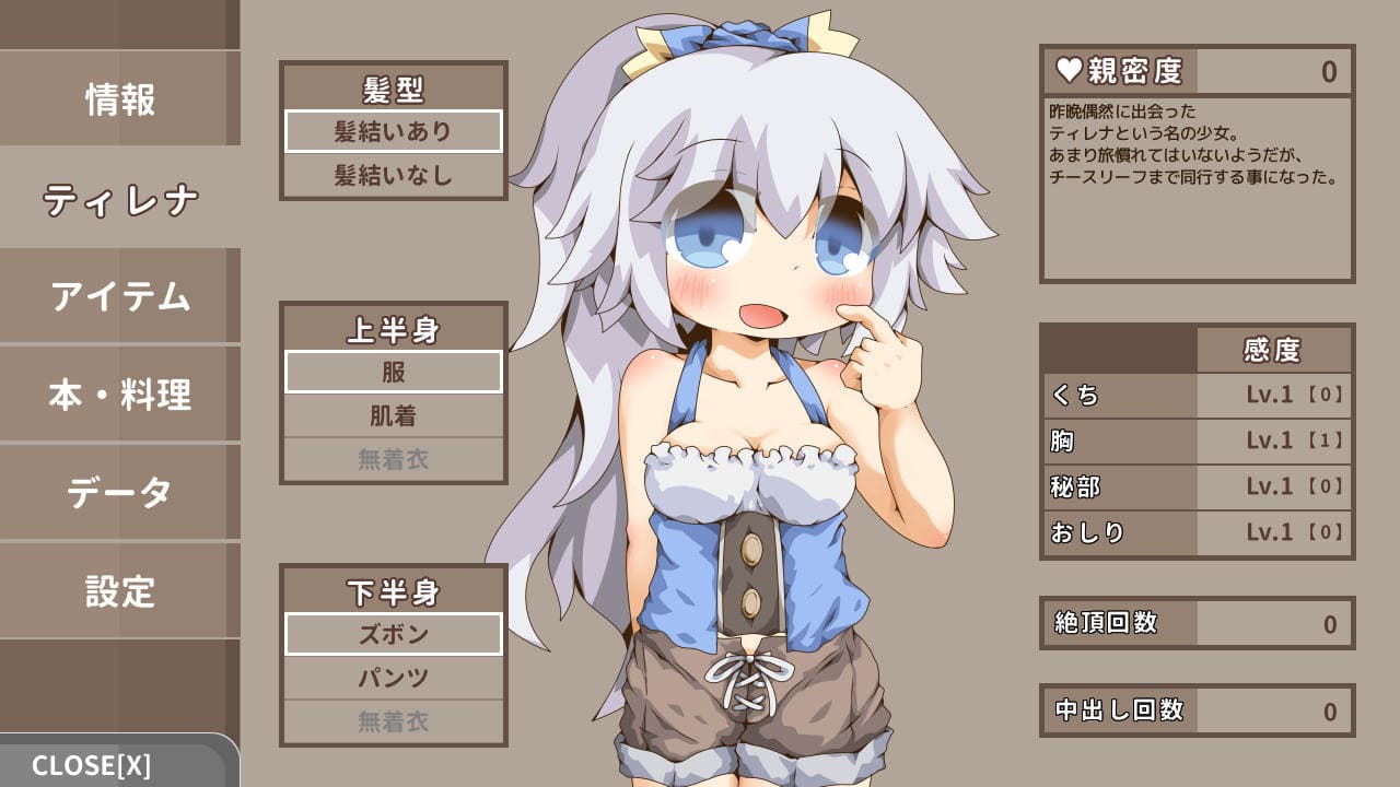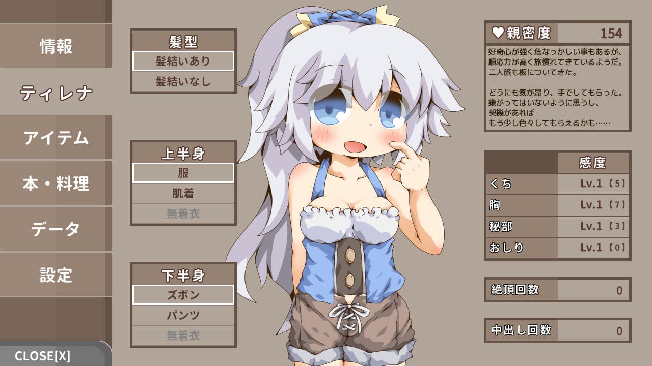 ▲メニュー→ティレナ。エロステや親密度を確認できる。下着姿、製品版では裸にひん剥くこともできる(本編立ち絵には反映しない