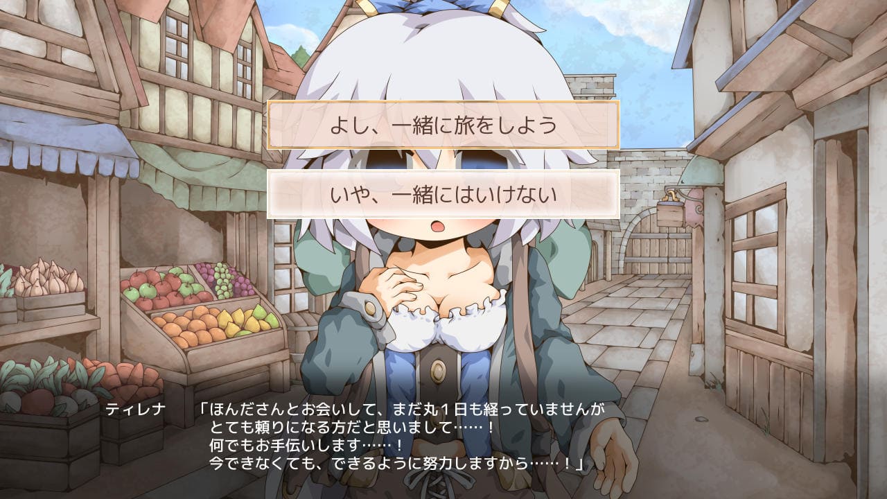 ▲彼女はティレナと名乗り、主人公に名前を聞いてきて名前決定。次の日、街まで一緒に行くことになり