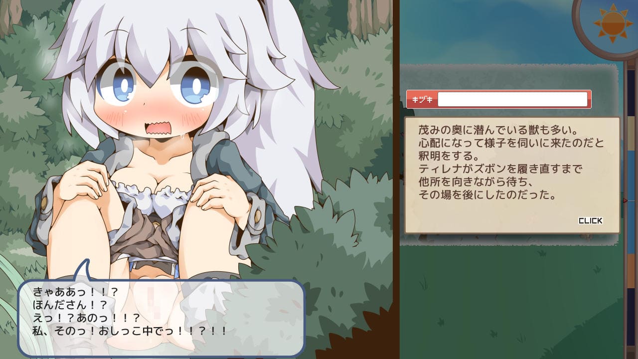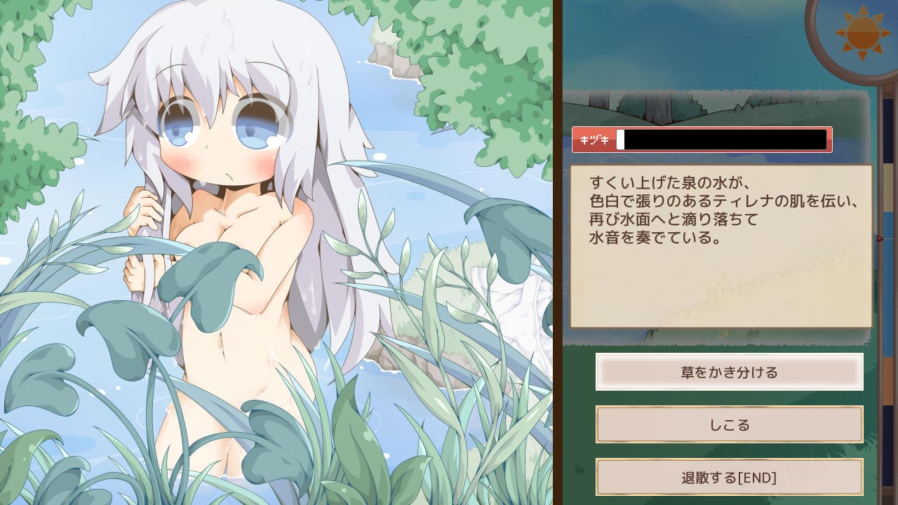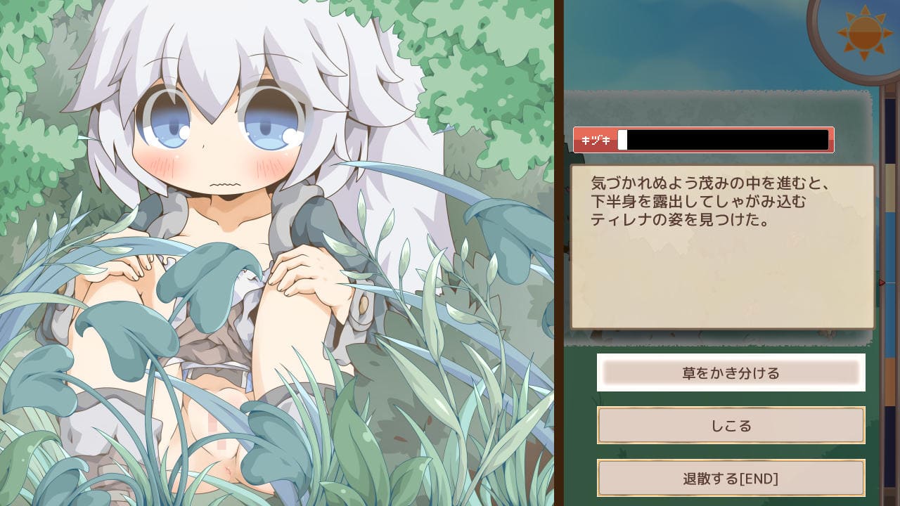 「草をかき分ける」ほど大事なところが見えるようになるが「キヅキ」ゲージの上昇が速くなる。「しこる」で射精するのがプレイヤーの本懐であるゆえ、かき分けを最低限にしてしこり始めてもいい。