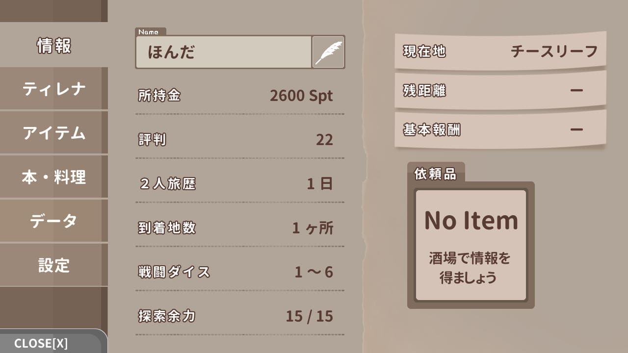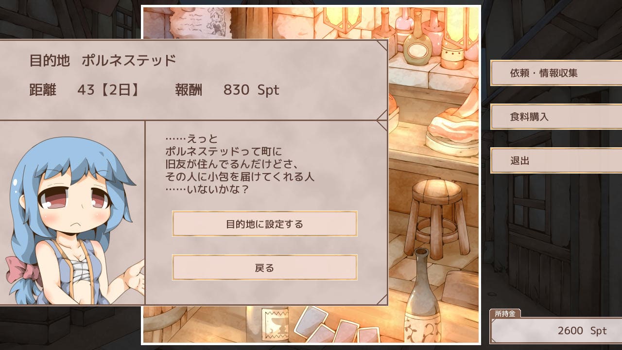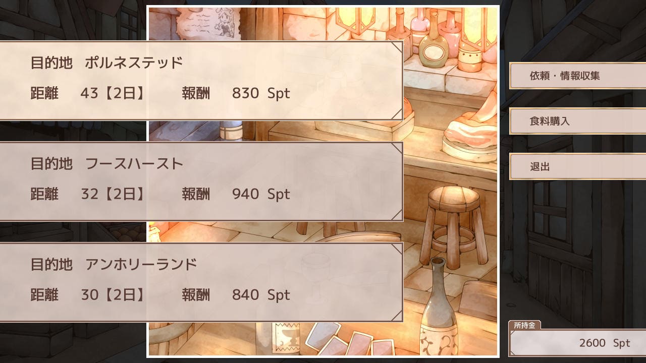 行き先(目的地)で何か変わるのかと思ったが、どうやら本作における街の名前はただの記号でどれを選んでも道中発生するイベント(ランダム?)や着いた先の街(の名前以外)のイベントや店も変わらない。単純に報酬と距離だけが違うっぽく、だったら報酬が高いのを選んで問題ないかと。ただ他と比べて報酬がいい依頼は若干リスクがあるかもしれない。これに関しては後述。