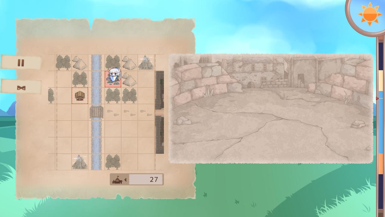 徒歩移動画面ではティレナが自動で画面左方向へと自動で移動していく。移動速度は画面左の砂時計アイコンをクリックすることで×4まで速くなる。Cキーか休止アイコンクリック、またはメニューを開くと一時停止。マウスカーソルをあわせたマスごとにティレナの立ち絵セリフが変化する。ティレナの立ち絵セリフはいろいろと仕込まれており、一つ上のスクショの街の基本画面でも然り。