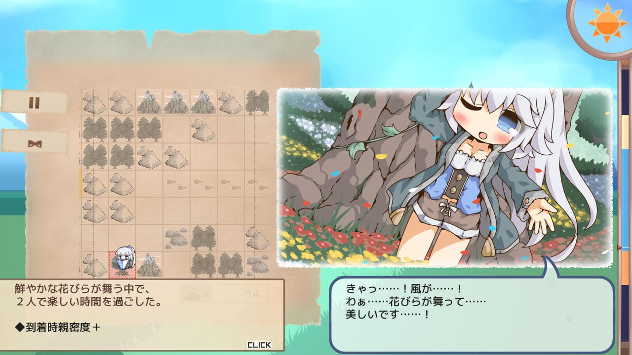 赤い枠のマスをクリックすると探索してイベントが発生、クリックするかは任意。クリックして発生するイベントはオブジェクトごとに異なり、ある程度ランダム性もありそうだった。