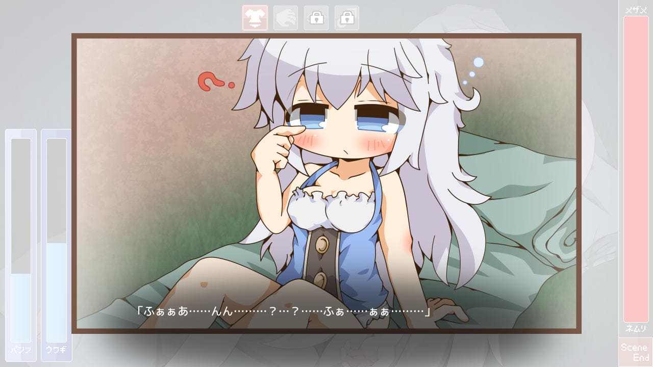 画面左上の四角ゲージは常に拡がる、縮まるを繰り返しており、最高に縮まった時点で該当箇所に対しクリックすることで「フトン」などの脱がすべきパーツのゲージが上げつつネムリゲージ上昇を最低限に留めることができる。