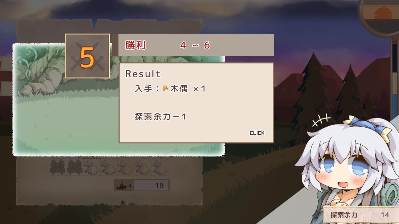 戦闘イベントでは6面ダイスを振ることで右に表示されている通りの結果となる。画面右下に表示されている「探索余力」は探索に必要な行動力なようなもので、戦闘の他各種イベントで減ったりする。これが尽きると探索できなくなるかと。