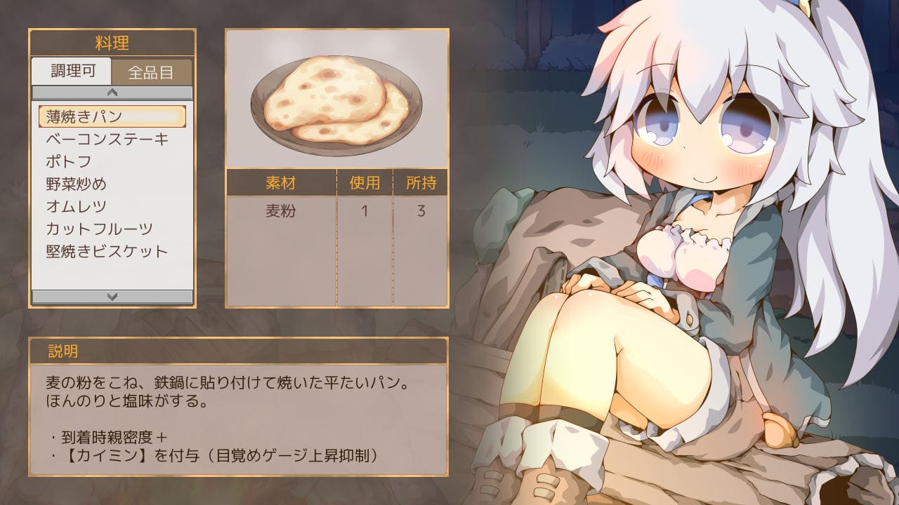 夜営ではまず料理を選択する。料理ごとに使用する素材は異なり食事効果も異なる。食事効果は次の日の戦闘が有利になったり、この後の悪戯エロで有利になったりなど様々。料理のバリエーションは書店でレシピ購入で増え、料理素材は酒場で購入。どちらも売っている種類はランダムっぽい。