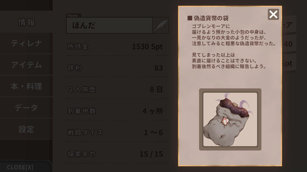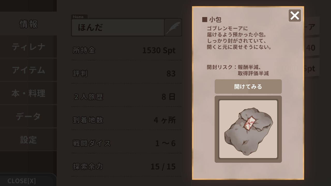 最後に、依頼で預かった手紙や小包は「開封」できる。開封すると中身をあらためることができるものの、依頼達成後の報酬と「評判」が半減してしまうリスクがある。