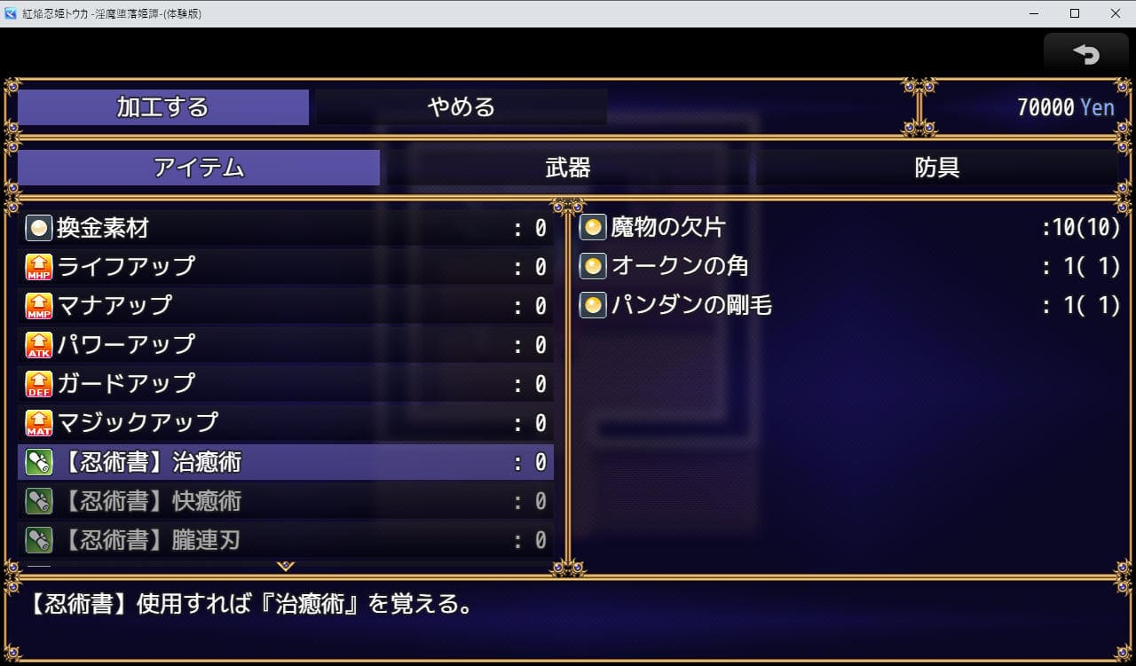 ▲本作には経験値とレベル概念が無く、ドロップアイテムと交換で能力アップ、忍術を習得するシステム