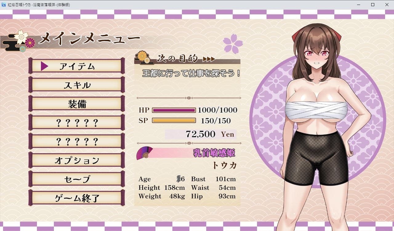 「フジノクニのサクヤ姫」という身分を隠し、見聞を広めるべく世界を巡る旅をしているトウカが主人公のMZ製RPG。3ヶ月ほど前から滞在しているハーベル村及びその周辺が舞台、ゲスい竿役達に身体を狙われながら金策に励むうち、運命を変える事件に巻き込まれていく。