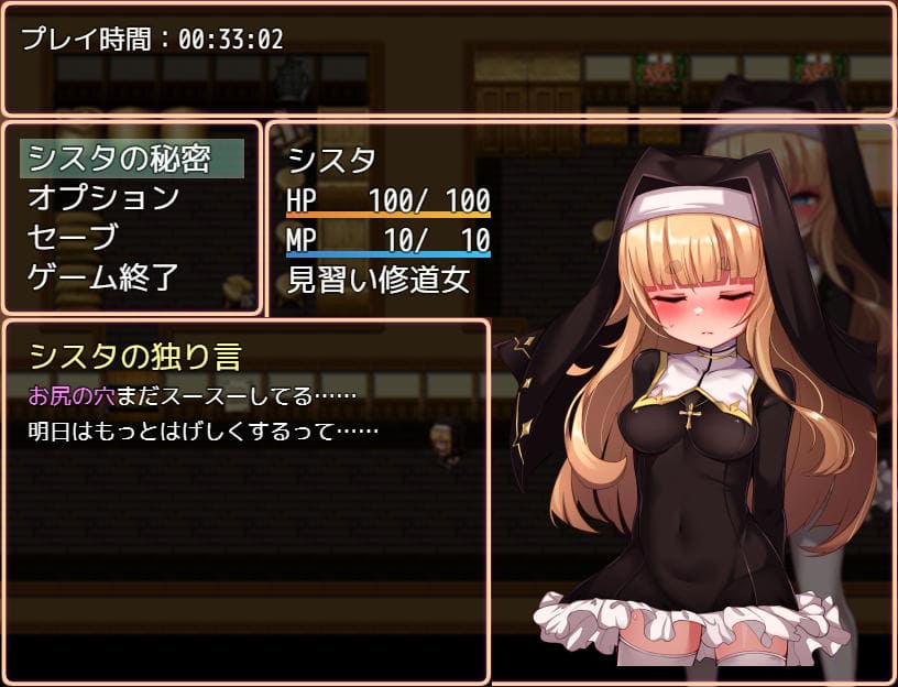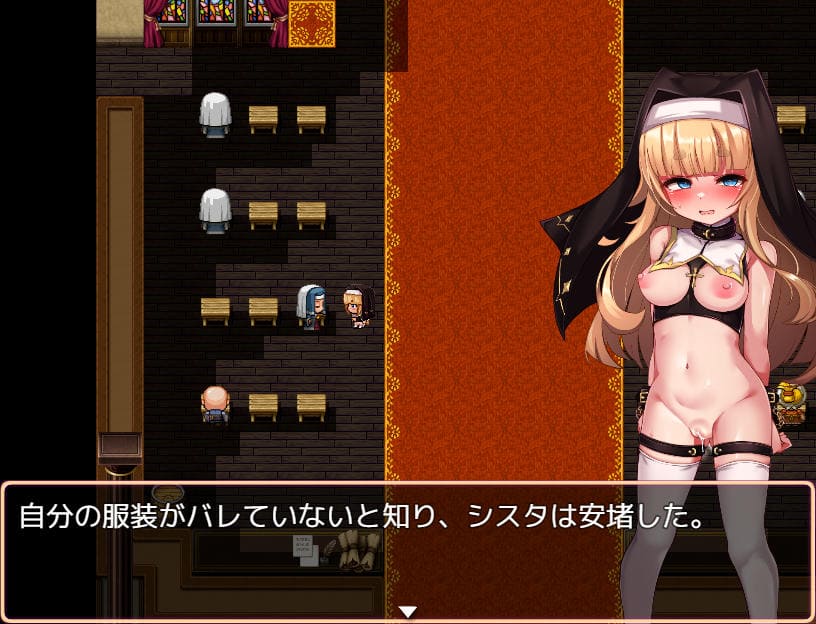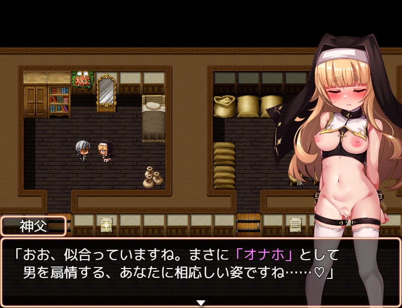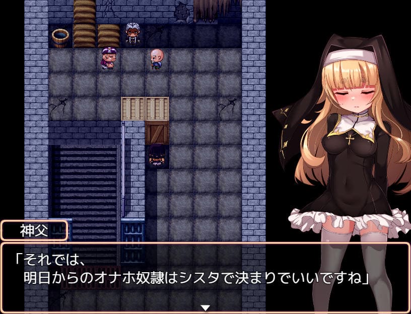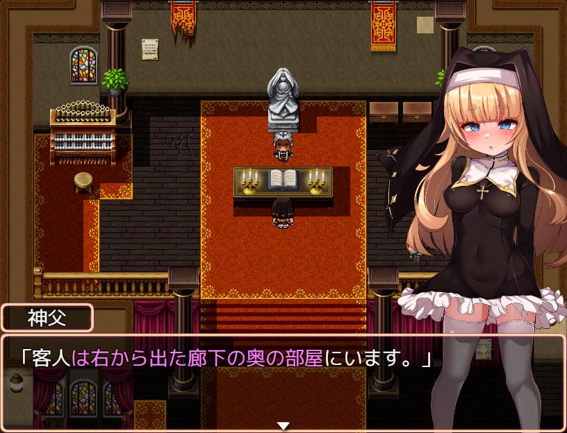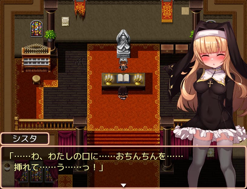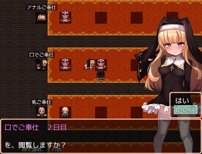 ゲームとしては何も難しいことはない、小さな教会マップ内で「!」吹き出しNPCを探しエロイベントを見ていくのみ。全てのイベントをこなすと翌日へ。