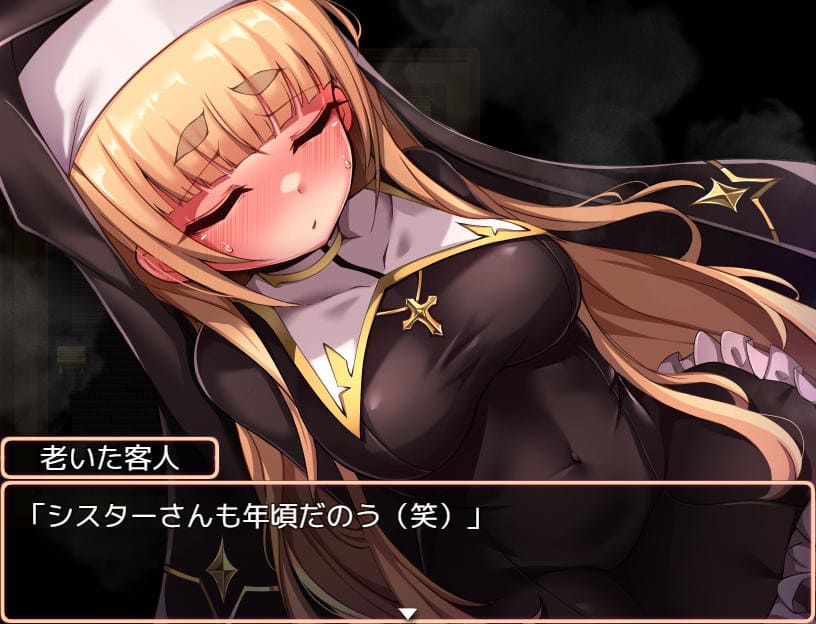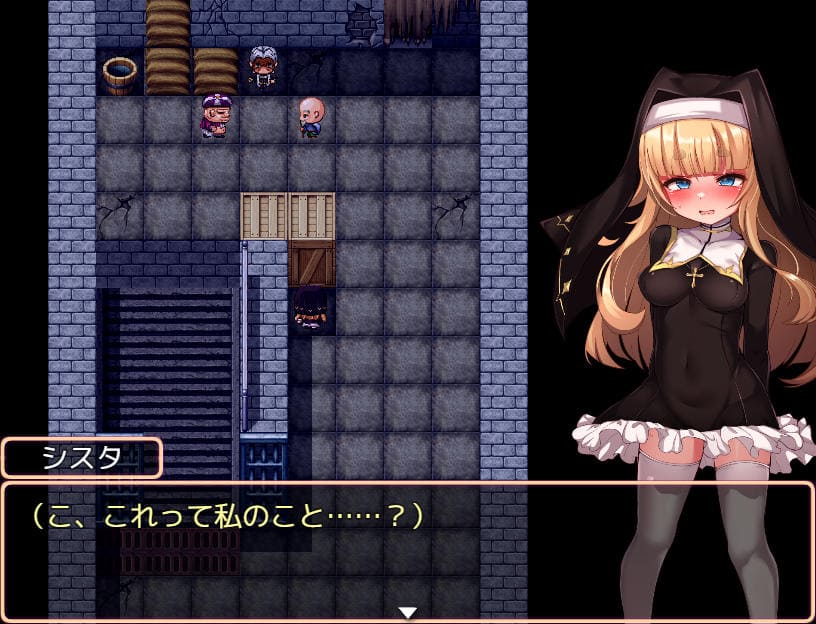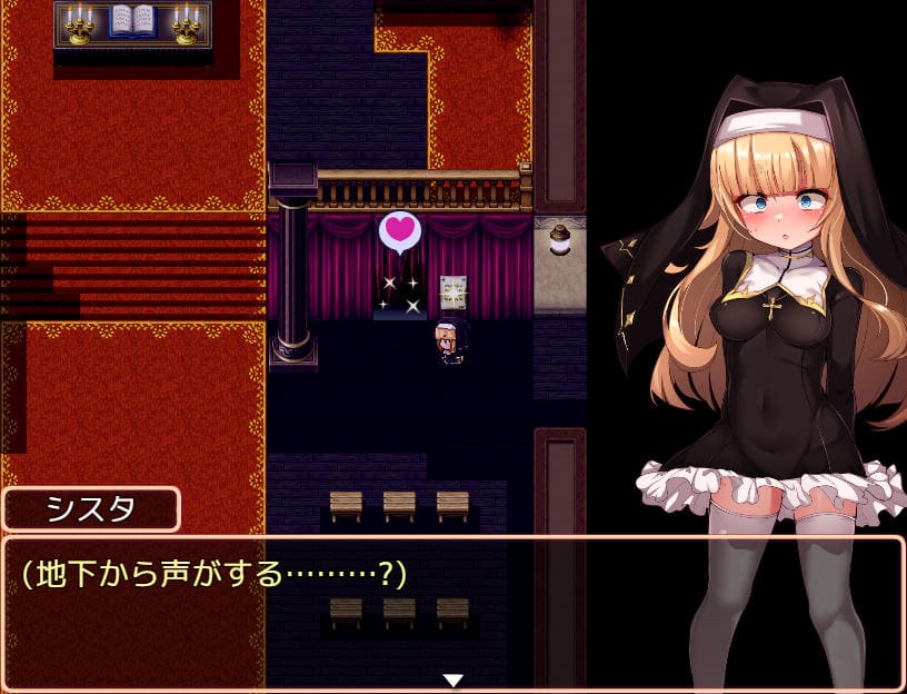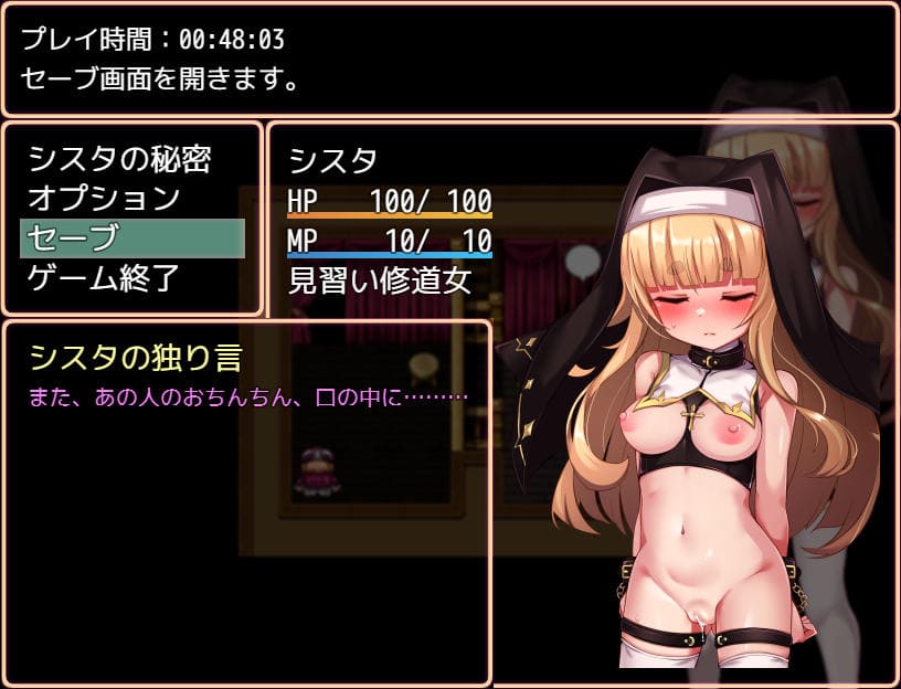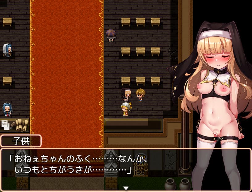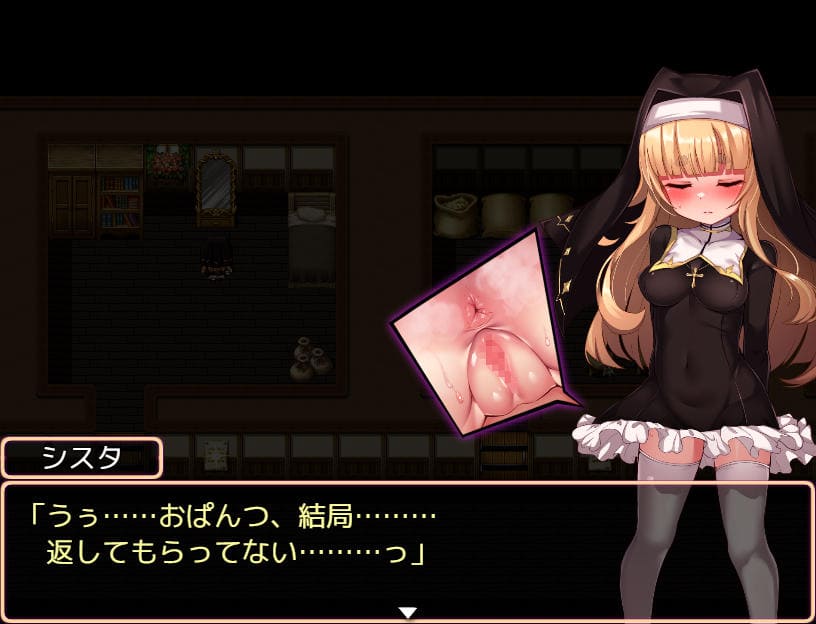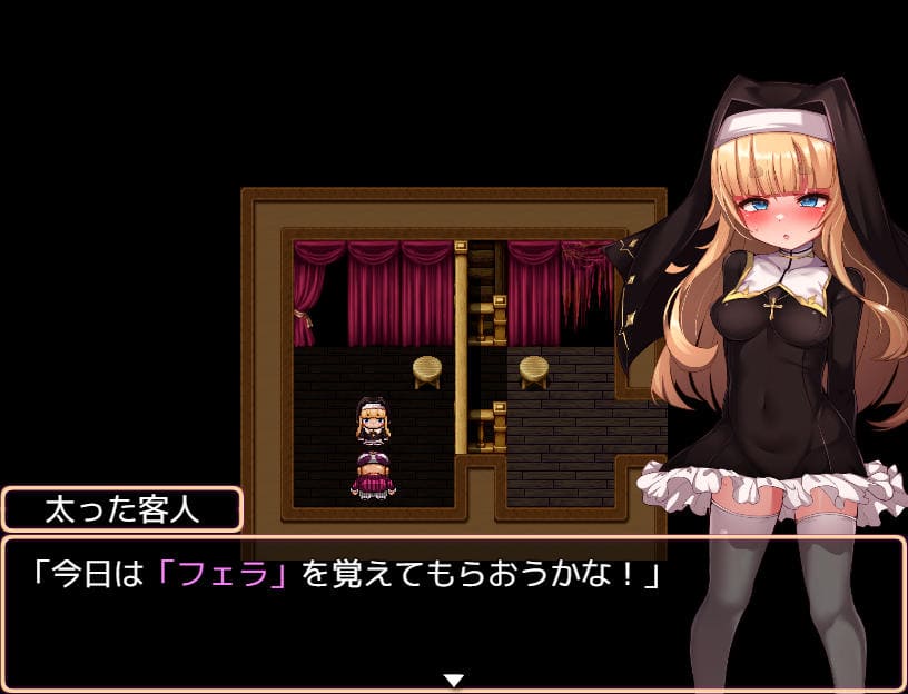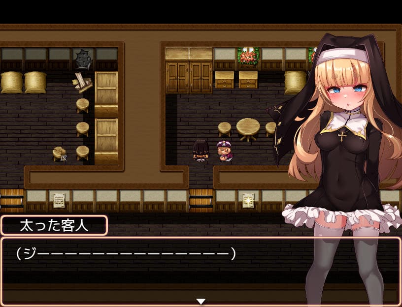 ゲームとしては何も難しいことはない、小さな教会マップ内で「!」吹き出しNPCを探しエロイベントを見ていくのみ。全てのイベントをこなすと翌日へ。