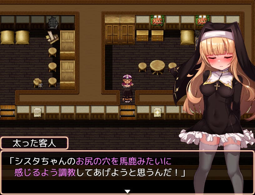 朝イチで懺悔室にて太った客人による口の調教、その後は神父に話しかけ、太った客人からの尻穴調教、老いた客人からの乳首調教を受ける。序盤はこの1セットで1日経過、それぞれのエロが段階的に進んでいく。