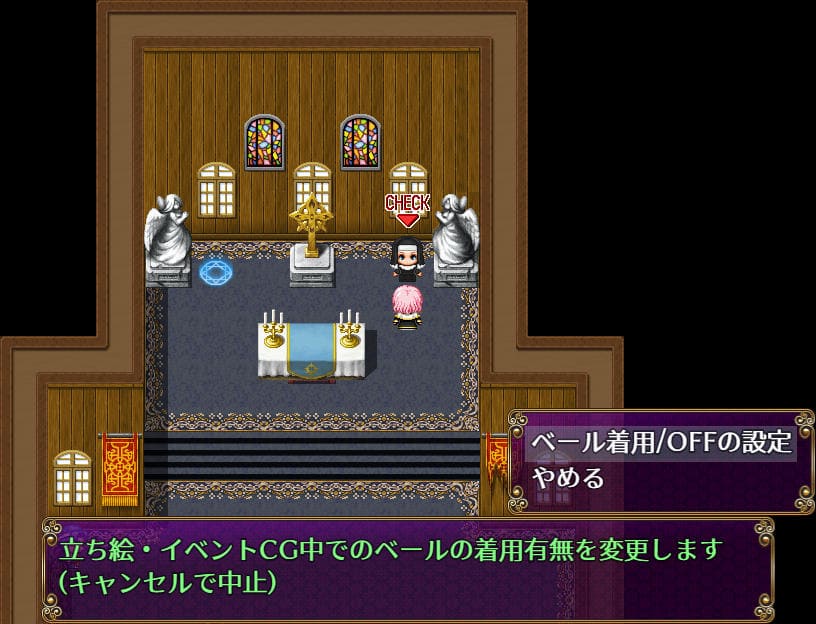 ▲メニュー→その他設定から、主人公立ち絵のベール着用有無を変更できる