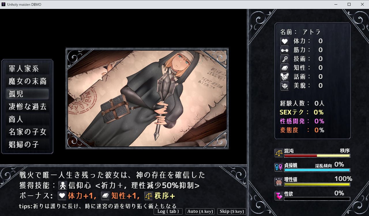 以上の話を踏まえたうえで、目的のプレイに沿いやすいキャラメイクをすべし。まぁキャラメイクの影響は本編での成長に比べれば微々たるもの。ただ処女プレイを目指す場合は気を付けなはれ、最初から経験人数が1人以上になったりエロステータスや性癖が付かないようなキャラメイクを。