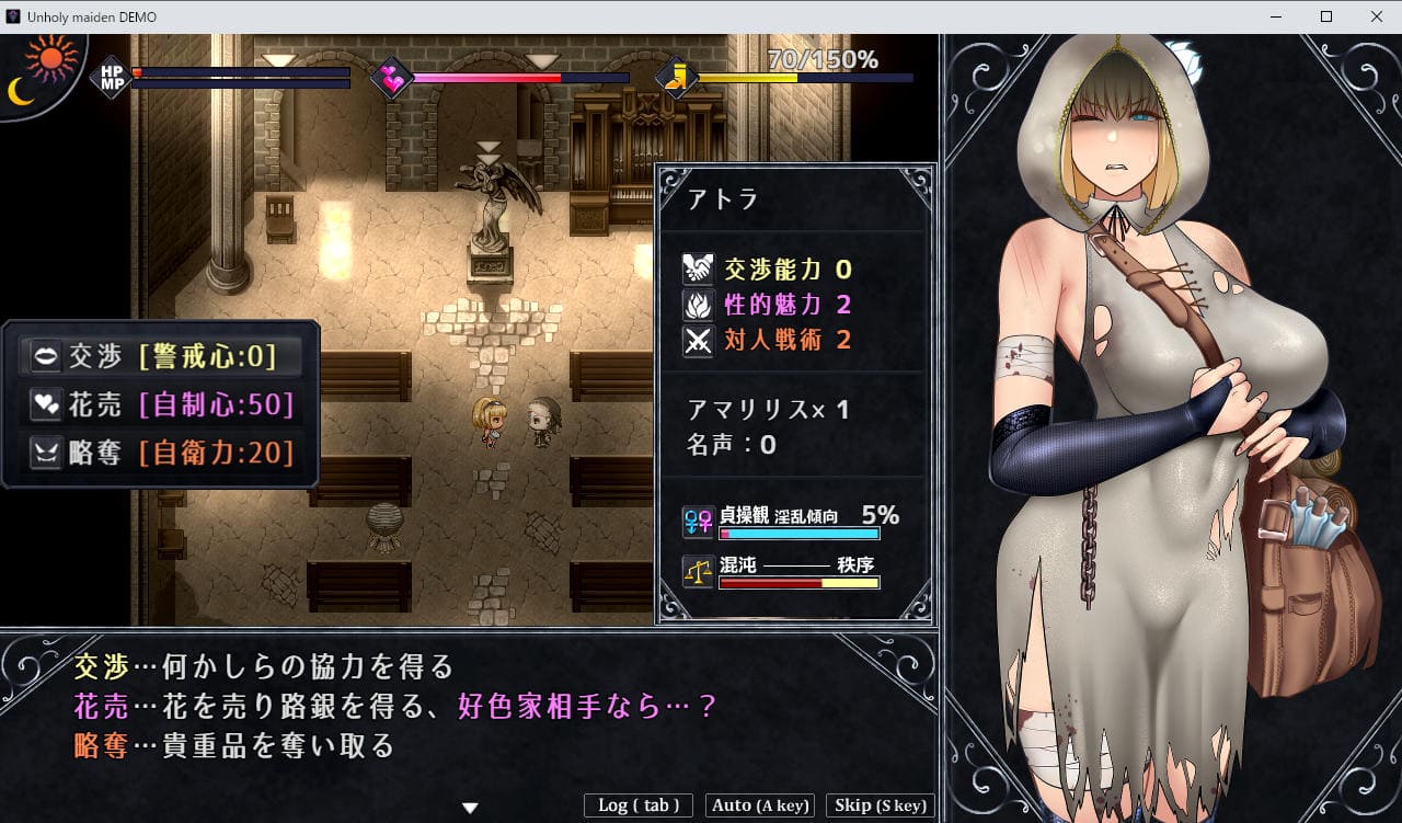 一方、交渉能力や性的魅力を重視する場合、NPC相手に平和的イベント、またはエロいイベントを発生させやすくなり、ダンジョンに潜らなくても稼ぎやすくなる(美貌ボーナスとか付く)。主人公自身が弱くてもギルドで「用心棒」を雇うことでダンジョンに潜れる。または強いNPCと関係深めて同伴してもらったり。