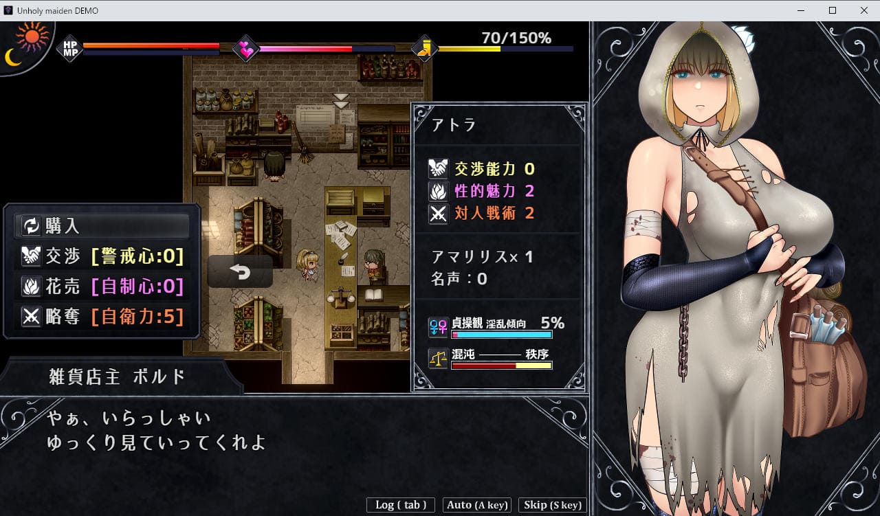 ゲーム開始後はなにはともあれまずは最低限寝泊まりできるお金が必要だ。この街にはダンジョン探索の他、ギルドの依頼やカジノ(スロット)、バニー、ダンサー、モデル、採掘などのバイト、売春など多数の金策があるが、我輩がまず目をつけたのは雑貨屋のアルバイト募集。いかにもエロありそうであるし。