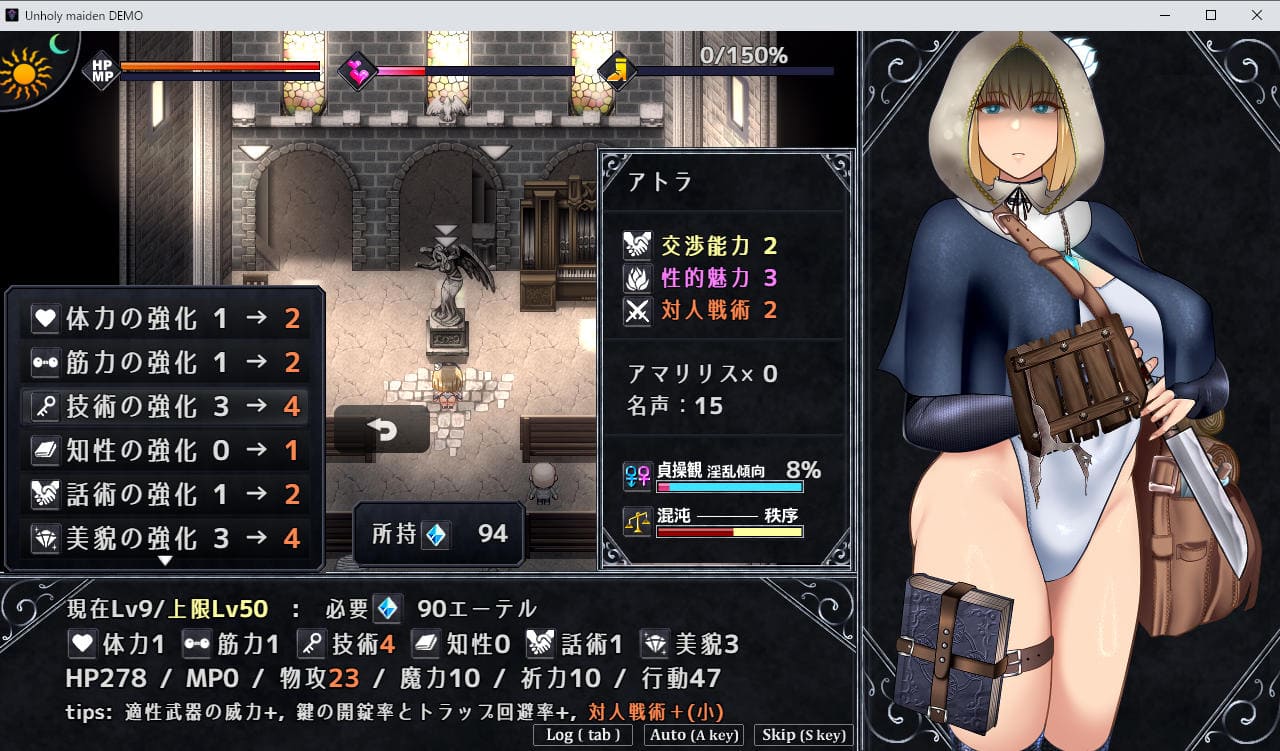 これらの能力値は戦闘や性的絶頂、様々なイベントで得られる「エーテル(経験値)」を消費して上昇、ただ満遍なく上げるより何れかに特化するのが定石だ。