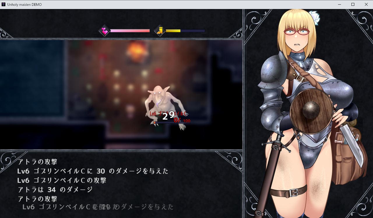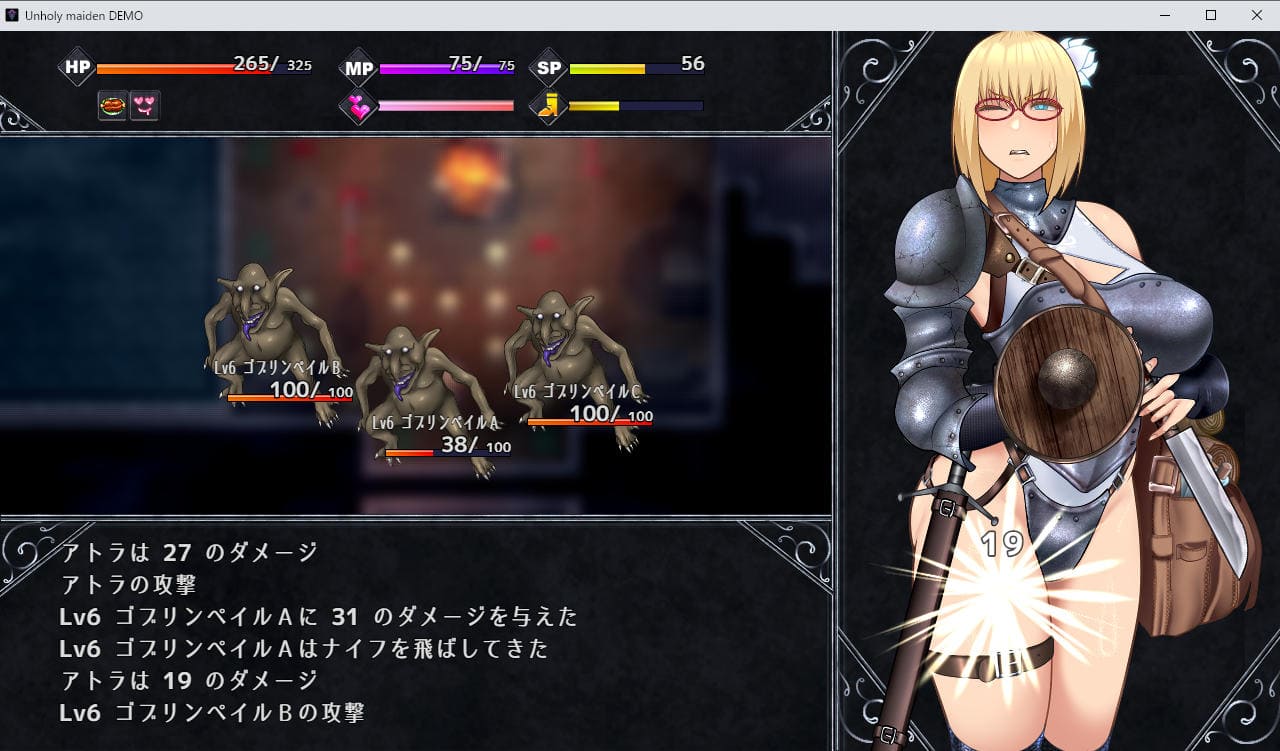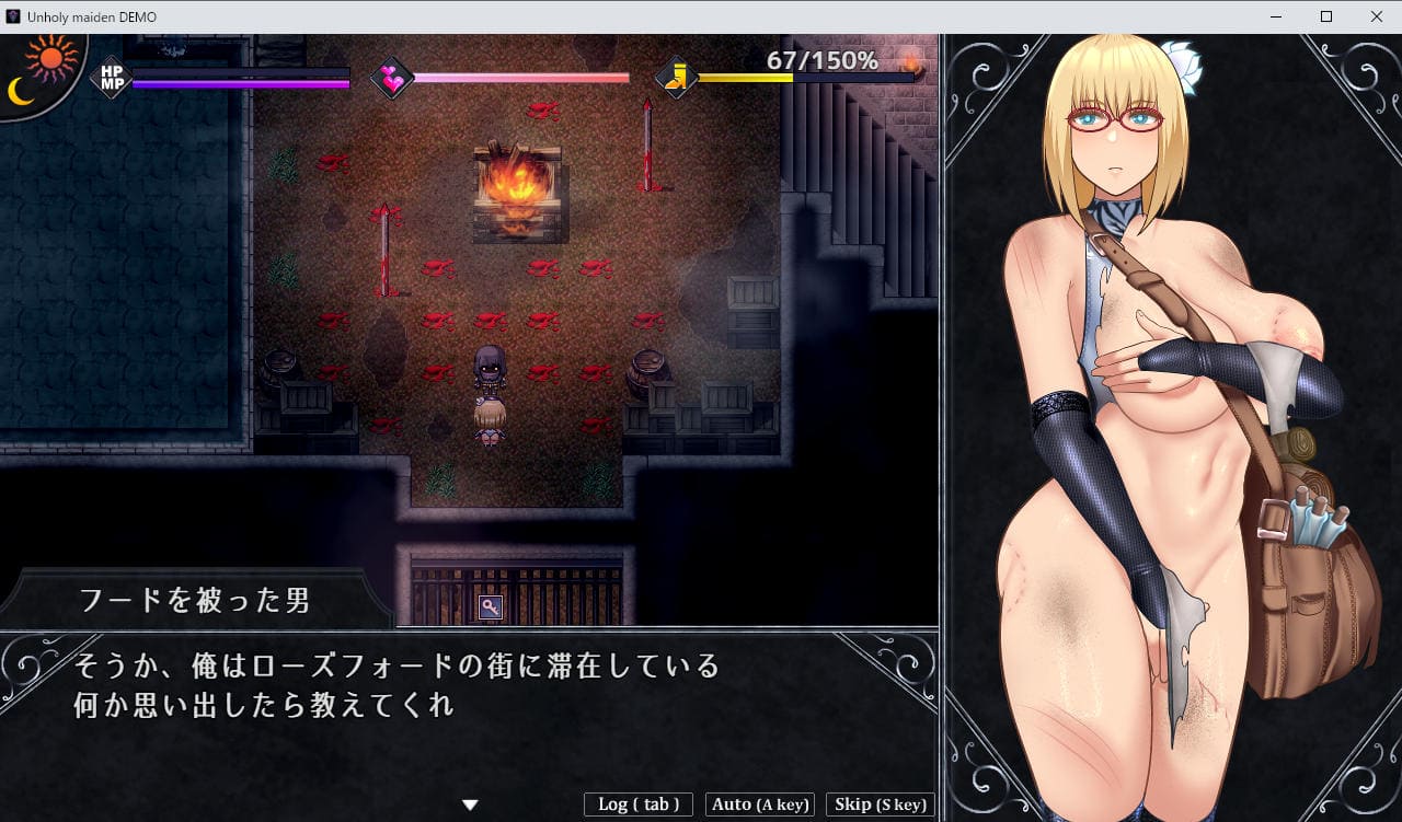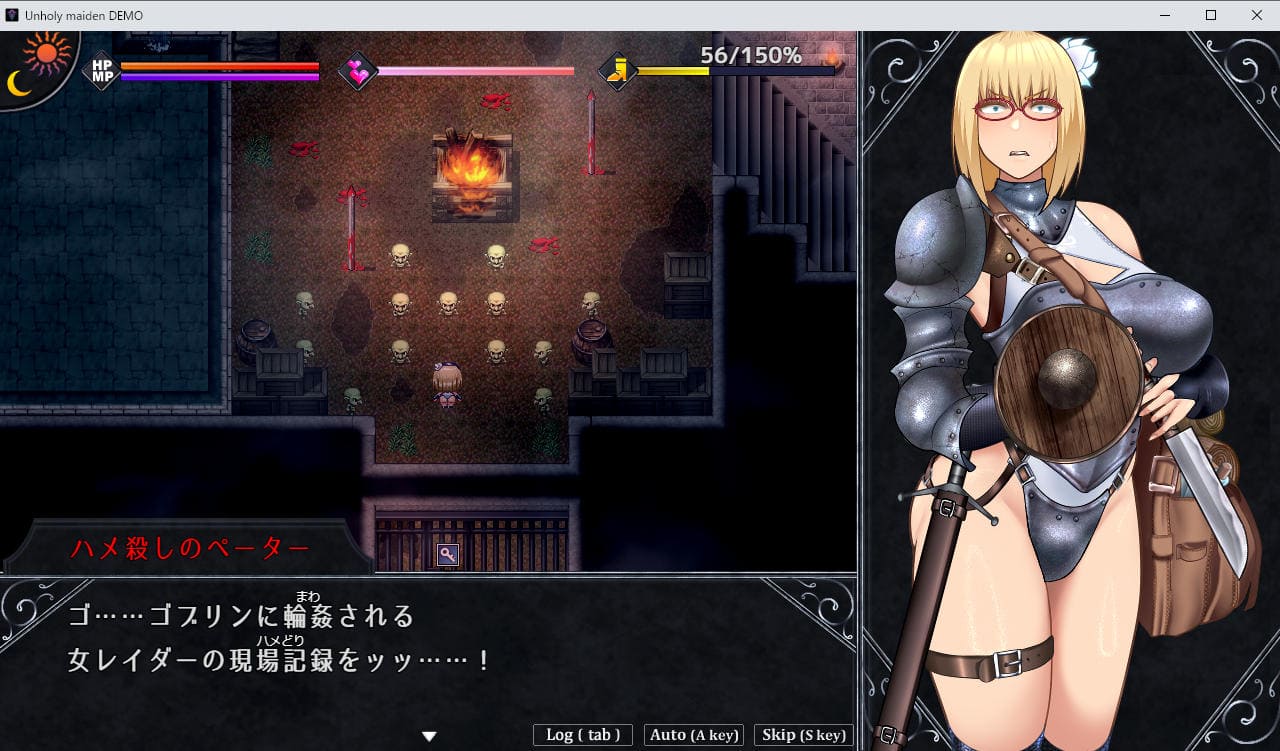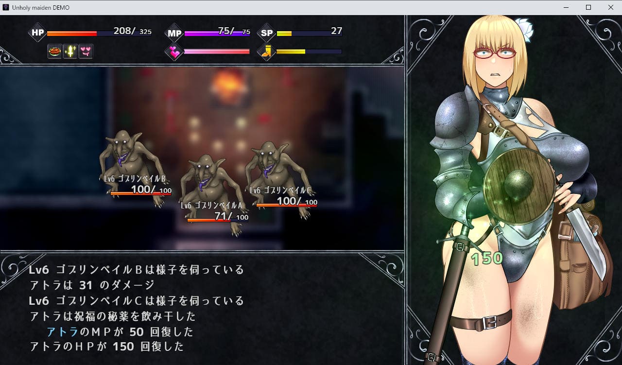 また敗北した場合は「理性(SAN値みたいなもの)」が大きく下がる。エロなどでも理性は少し下がるが、理性が下がるほど秘薬での回復効果が薄くなり、ゼロになるとGAMEOVER。2周目行き。