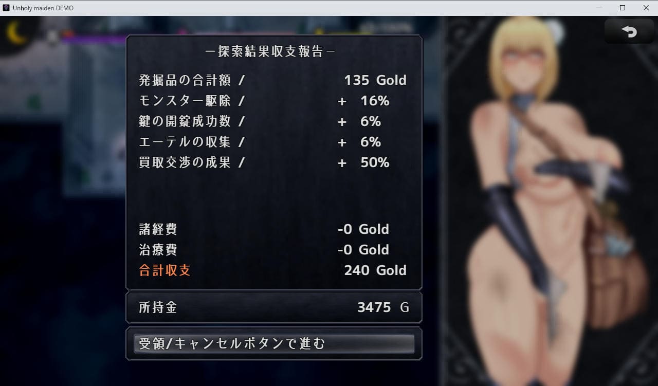 ダンジョンから脱出する度にリザルト表示、探索中に拾った発掘品の合計額にモンスター駆除などの歩合が上乗せされて精算される。敗北した場合もこの画面になり治療費・諸経費などがかかりマイナスになることもある。
